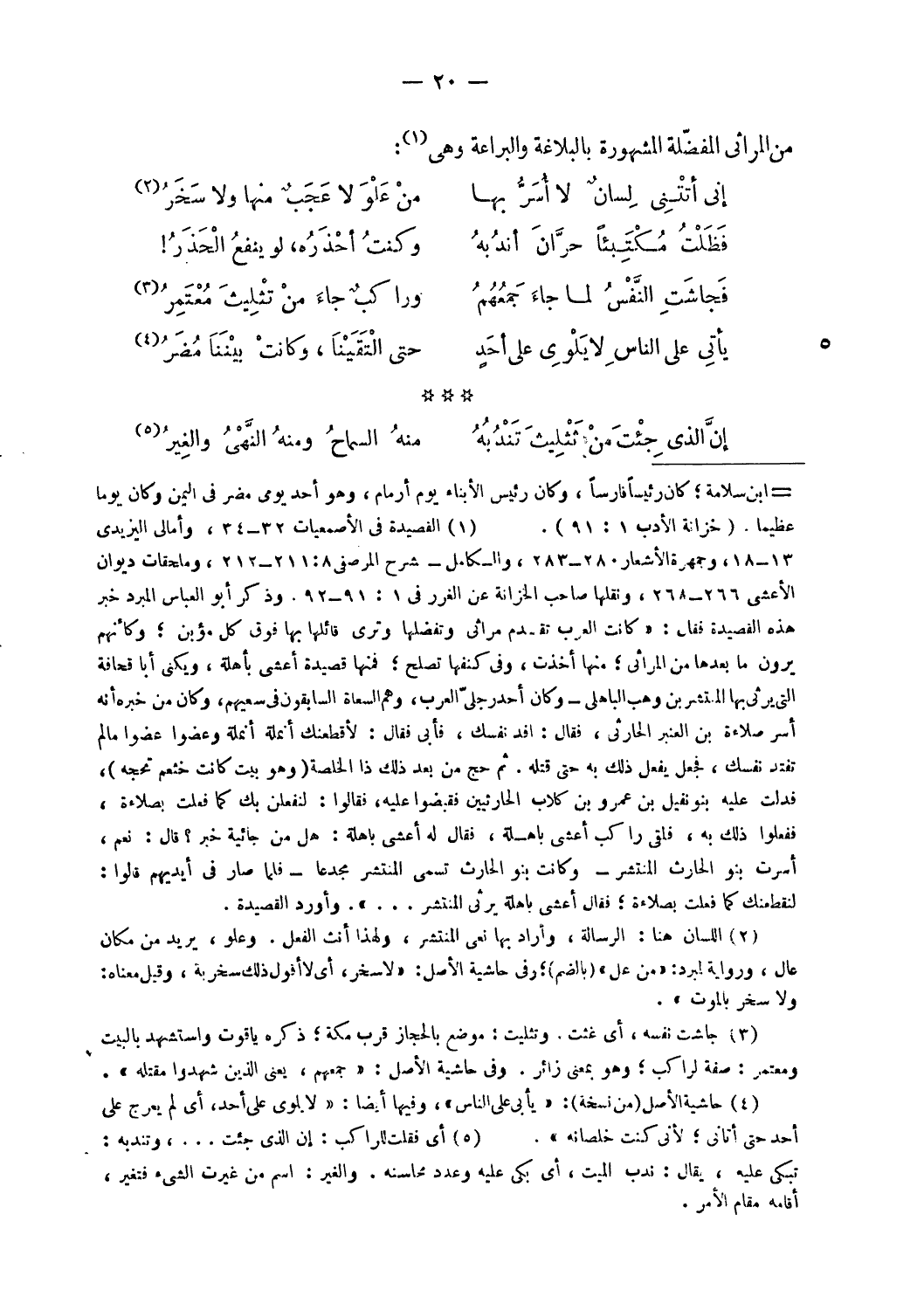 (¬2) اللسان هنا: الرسالة، وأراد بها نعى المنتشر، ولهذا أنث الفعل. وعلو، يريد من مكان عال، ورواية لمبرد: «من عل» (بالضم)؛ وفى حاشية الأصل: «لا سخر، أى لا أقول ذلك سخرية، وقيل معناه: