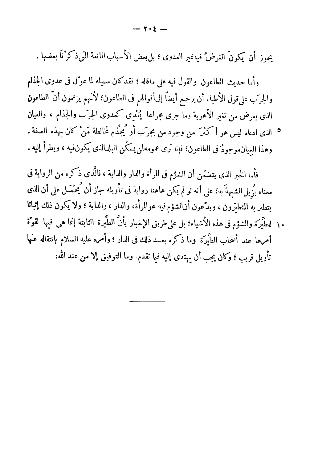 فأما الخبر الّذي يتضمّن أن الشؤم فى المرأة والدار والدابة، فالّذى ذكره من الرواية فى معناه يزيل الشبهة به؛ على أنه لو لم يكن هاهنا رواية فى تأويله جاز أن يحمل على أن الّذي يتطير به المتطيّرون، ويدّعون أن الشؤم فيه هو المرأة، والدار، والدابة؛ ولا يكون ذلك إثباتا للطّيرة والشؤم فى هذه الأشياء؛ بل على طريق الإخبار بأنّ الطّيرة الثابتة إنما هى فيها لقوّة أمرها عند أصحاب الطّيرة وما ذكره بعد ذلك فى الدار؛ وأمره عليه السلام بانتقاله عنها تأويل قريب؛ وكان يجب أن يهتدى إليه فيما تقدم. وما التوفيق إلا من عند الله.