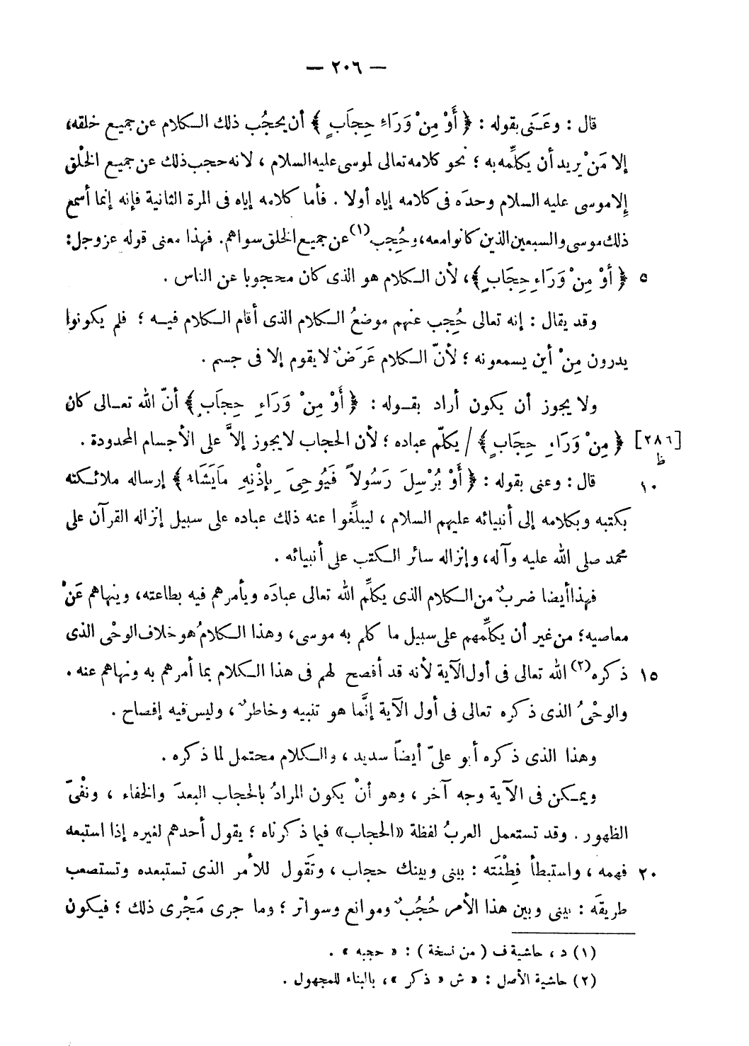 قال: وعنى بقوله: أَوْ مِنْ وَراءِ حِجابٍ أن يحجب ذلك الكلام عن جميع خلقه، إلا من يريد أن يكلّمه به؛ نحو كلامه تعالى لموسى عليه السلام، لانه حجب ذلك عن جميع الخلق إلا موسى عليه السلام وحده فى كلامه إياه أولا. فأما كلامه إياه فى المرة الثانية فإنه إنما أسمع ذلك موسى والسبعين الذين كانوا معه، وحجب (¬1) عن جميع الخلق سواهم. فهذا معنى قوله عز وجل:
