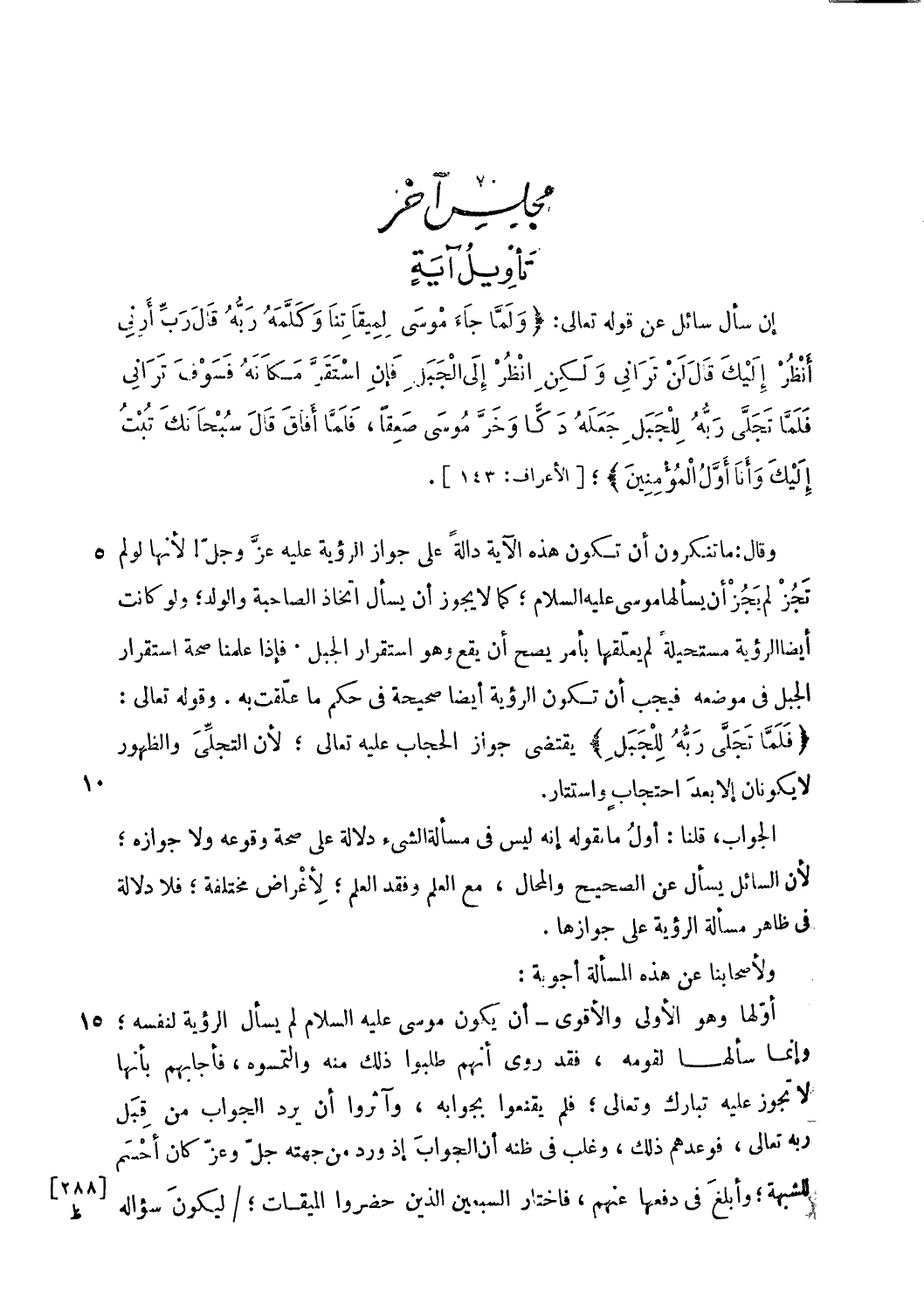 وقال: ما تنكرون أن تكون هذه الآية دالة على جواز الرؤية عليه عزّ وجلّ! لأنها لو لم تجز لم يجز أن يسألها موسى عليه السلام؛ كما لا يجوز أن يسأل اتخاذ الصاحبة والولد؛ ولو كانت أيضا الرؤية مستحيلة لم يعلّقها بأمر يصح أن يقع وهو استقرار الجبل. فإذا علمنا صحة استقرار الجبل فى موضعه فيجب أن تكون الرؤية أيضا صحيحة فى حكم ما علّقت به. وقوله تعالى: