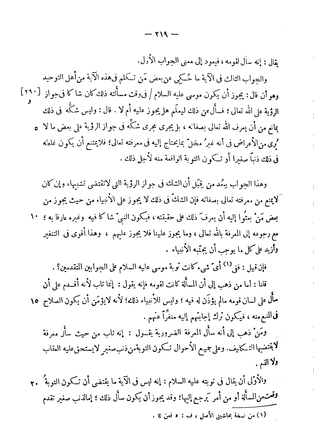 ومن ذهب إلى أنه سأل المعرفة الضرورية يقول: إنه تاب من حيث سأل معرفة لا يقتضيها التكليف. وعلى جميع الأحوال تكون التوبة من ذنب صغير لا يستحق عليه العقاب ولا الذم.