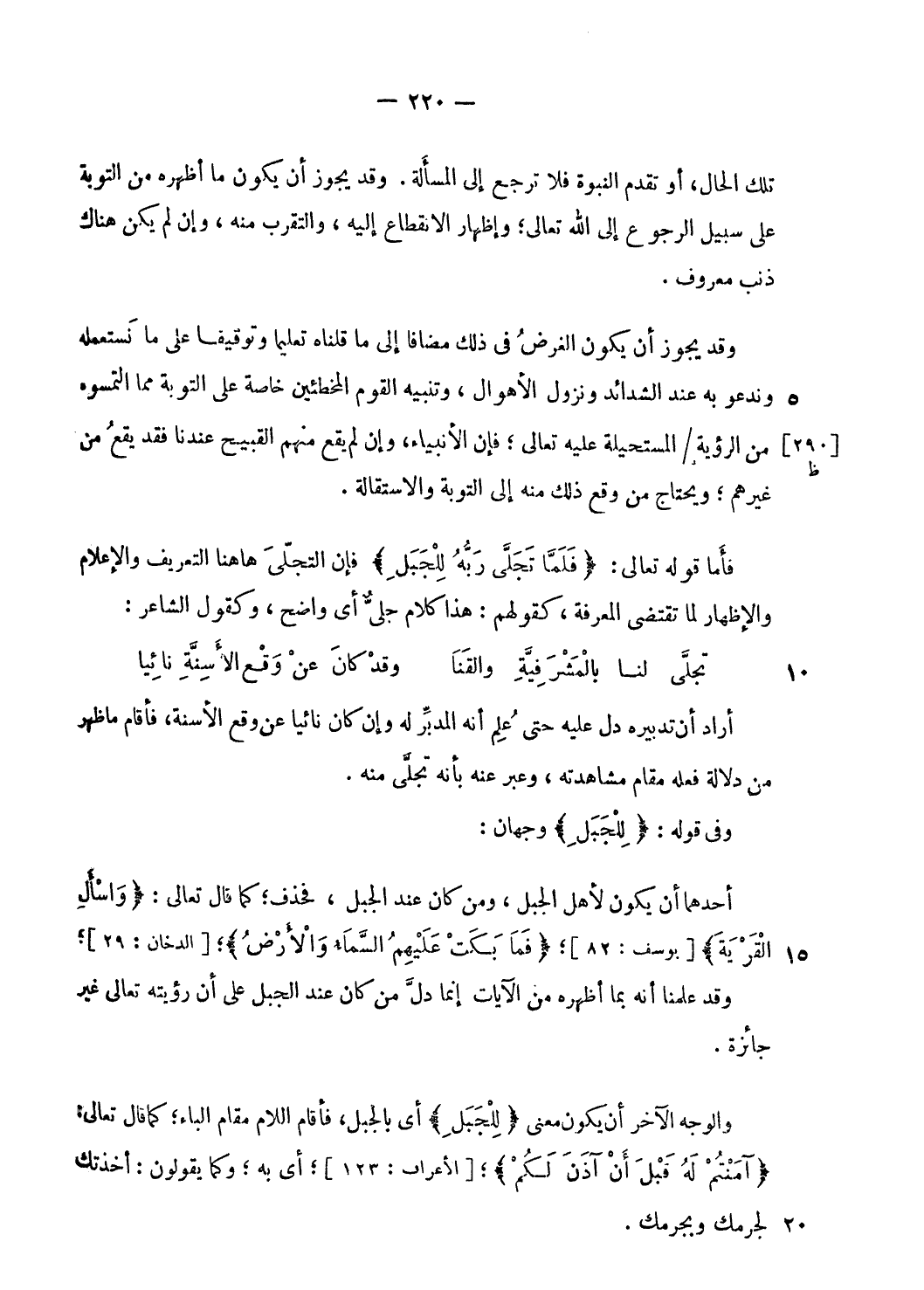 وقد يجوز أن يكون الغرض فى ذلك مضافا إلى ما قلناه تعليما وتوفيقا على ما نستعمله وندعو به عند الشدائد ونزول الأهوال، وتنبيه القوم المخطئين خاصة على التوبة مما التمسوه من الرؤية/ المستحيلة عليه تعالى؛ فإن الأنبياء، وإن لم يقع منهم القبيح عندنا فقد يقع من غيرهم؛ ويحتاج من وقع ذلك منه إلى التوبة والاستقالة.