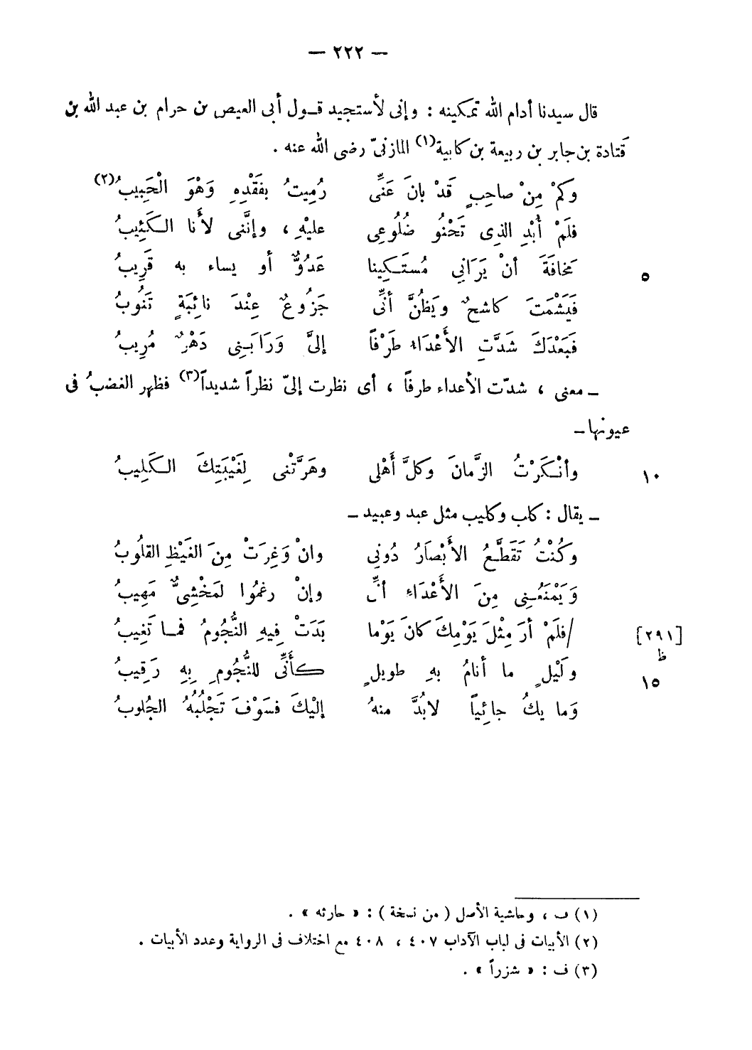 قال سيدنا أدام الله تمكينه: وإنى لأستجيد قول أبى العيص بن حرام بن عبد الله بن قتادة بن جابر بن ربيعة بن كابية (¬1) المازنىّ رضى الله عنه.
