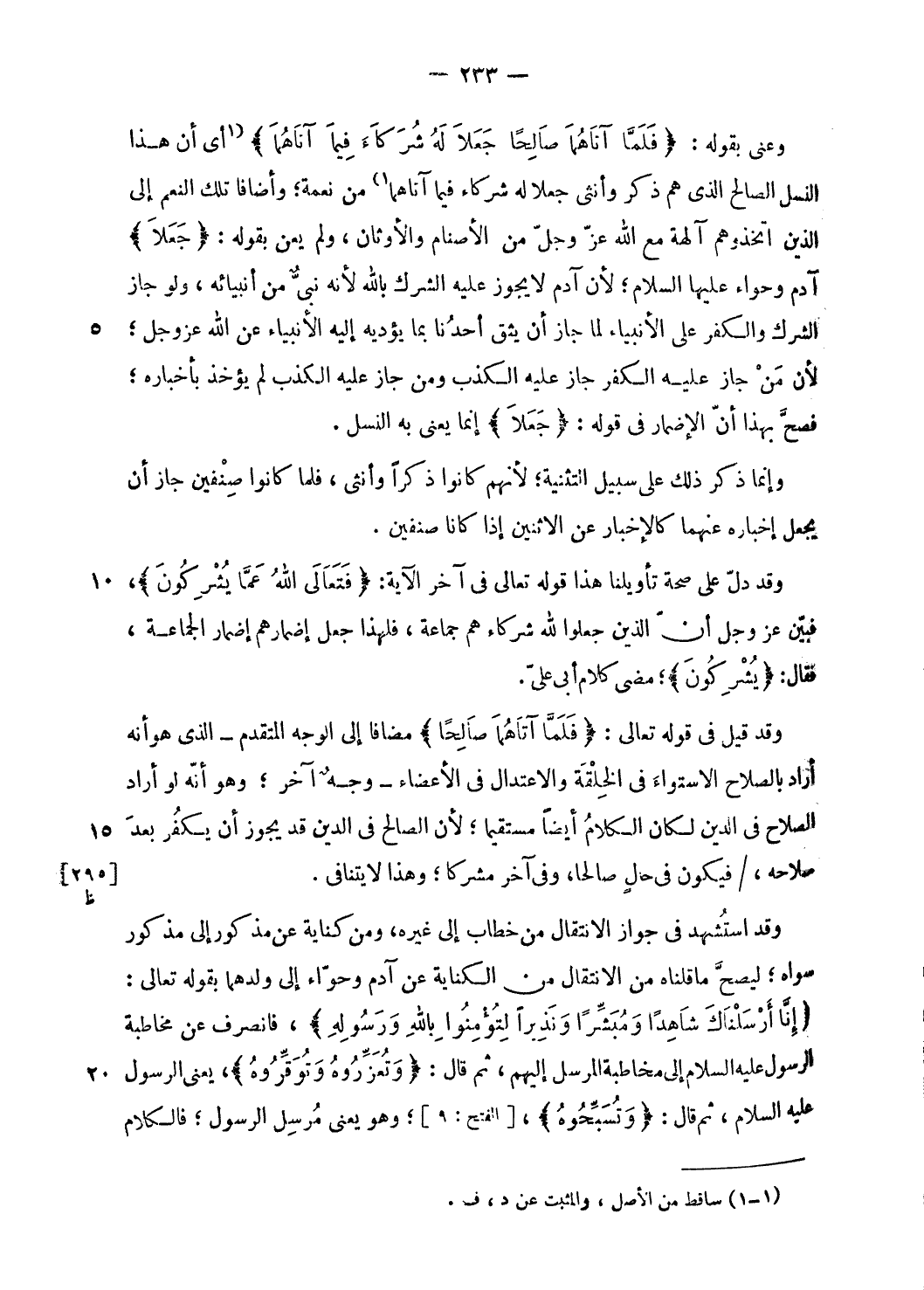 وعنى بقوله: فَلَمَّا آتاهُما صالِحاً جَعَلا لَهُ شُرَكاءَ فِيما آتاهُما [أى أن هذا النسل الصالح الّذي هم ذكر وأنثى جعلا له شركاء فيما آتاهما] (¬1) من نعمة؛ وأضافا تلك النعم إلى الذين اتخذوهم آلهة مع الله عزّ وجلّ من الأصنام والأوثان، ولم يعن بقوله: جَعَلا آدم وحواء عليها السلام؛ لأن آدم لا يجوز عليه الشرك بالله لأنه نبىّ من أنبيائه، ولو جاز الشرك والكفر على الأنبياء لما جاز أن يثق أحدنا بما يؤديه إليه الأنبياء عن الله عز وجل؛ لأن من جاز عليه الكفر جاز عليه الكذب ومن جاز عليه الكذب لم يؤخذ بأخباره؛ فصحّ بهذا أنّ الإضمار فى قوله: جَعَلا إنما يعنى به النسل.