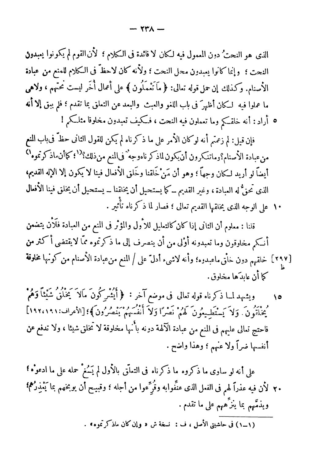 الّذي هو النحت دون المعمول فيه لكان لا فائدة فى الكلام؛ لأن القوم لم يكونوا يعبدون النحت؛ وإنما كانوا يعبدون محل النحت؛ ولأنه كان لا حظّ فى الكلام للمنع من عبادة الأصنام. وكذلك إن حمل قوله تعالى: ما تَعْمَلُونَ على أعمال أخر ليست نحتهم، ولا هى ما عملوا فيه لكان أظهر فى باب اللغو والعبث والبعد عن التعلق بما تقدم؛ فلم يبق إلا أنه أراد: أنه خلقكم وما تعملون فيه النحت، فكيف تعبدون مخلوقا مثلكم!