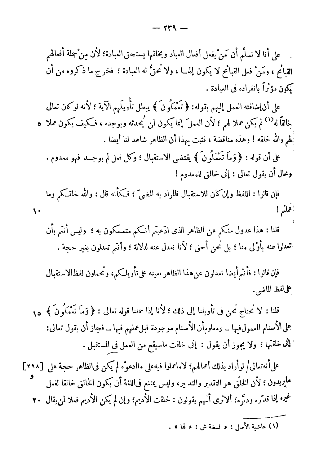 قلنا: لا نحتاج نحن فى تأويلنا إلى ذلك؛ لأنا إذا حملنا قوله تعالى: وَما تَعْمَلُونَ على الأصنام المعمول فيها- ومعلوم أن الأصنام موجودة قبل عملهم فيها- فجاز أن يقول تعالى:
