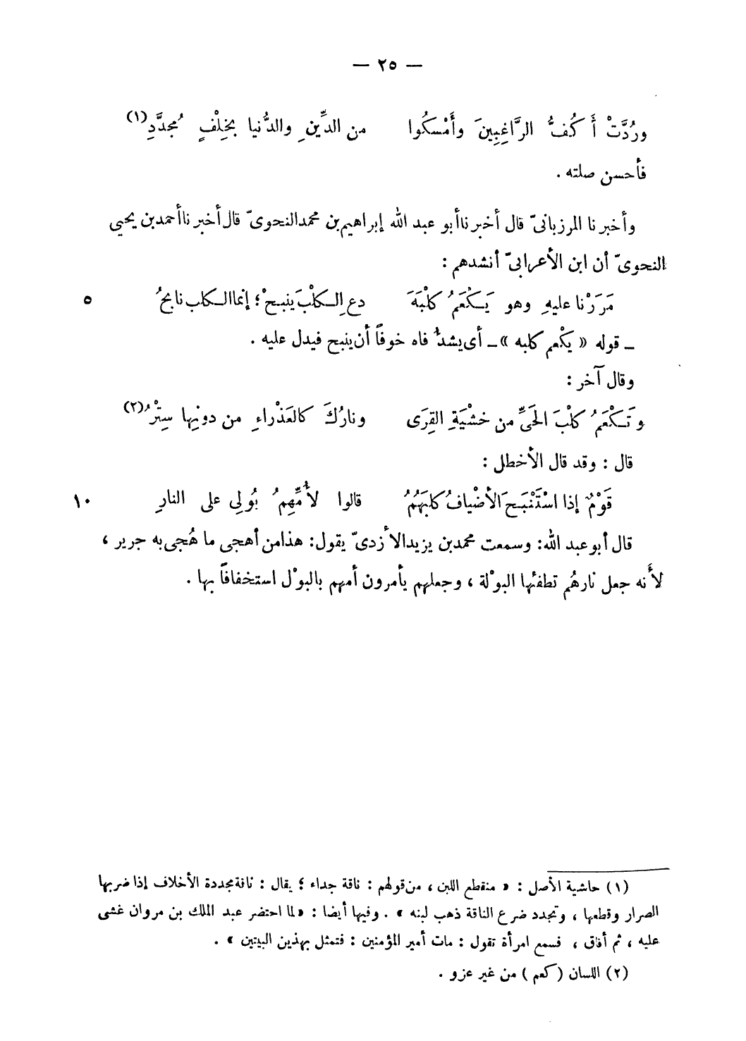 وأخبرنا المرزبانىّ قال أخبرنا أبو عبد الله إبراهيم بن محمد النحوىّ قال أخبرنا أحمد بن يحيى النحوىّ أن ابن الأعرابىّ أنشدهم: