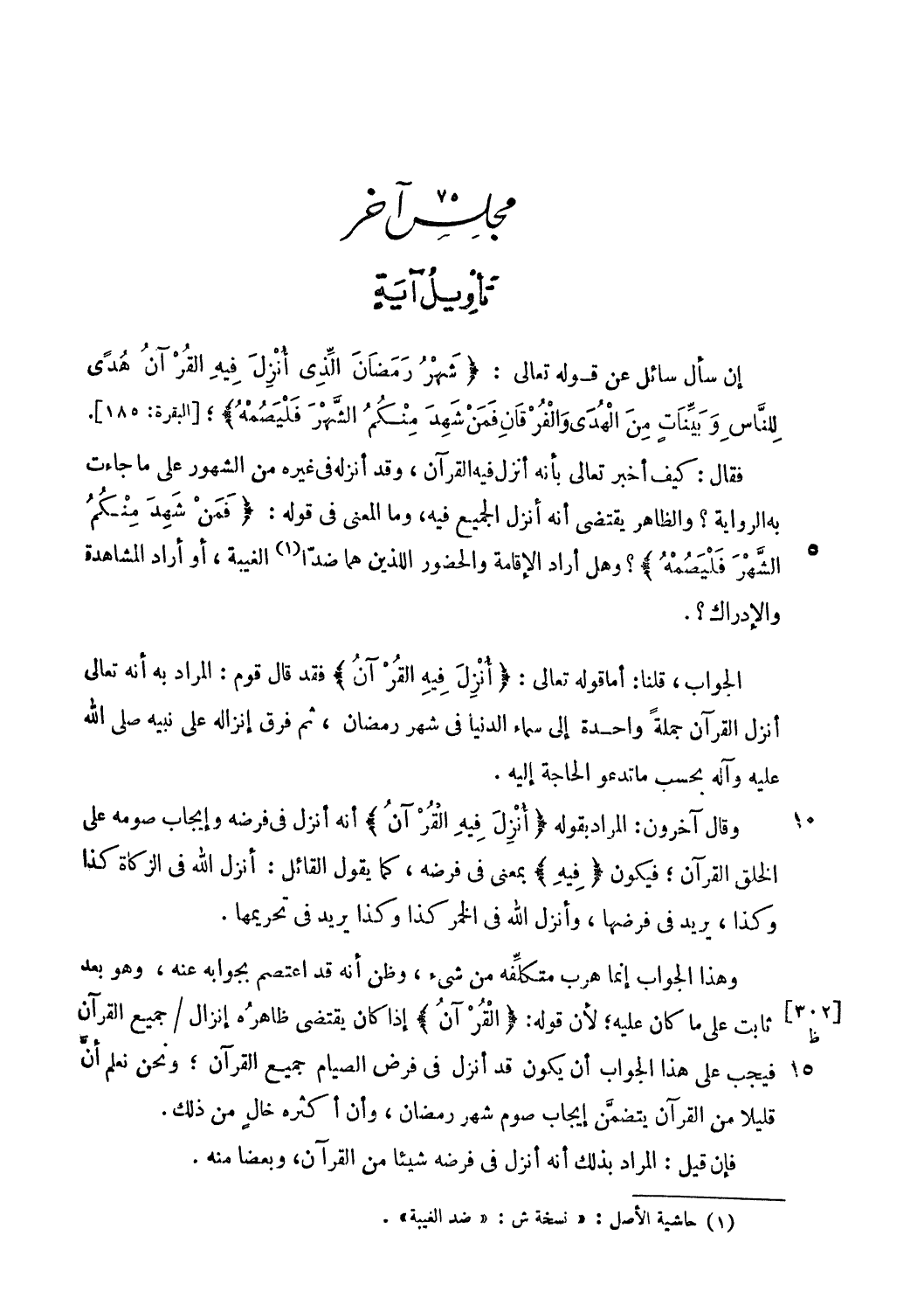 فقال: كيف أخبر تعالى بأنه أنزل فيه القرآن، وقد أنزله فى غيره من الشهور على ما جاءت به الرواية؟ والظاهر يقتضي أنه أنزل الجميع فيه، وما المعنى فى قوله: فَمَنْ شَهِدَ مِنْكُمُ الشَّهْرَ فَلْيَصُمْهُ؟ وهل أراد الإقامة والحضور اللذين هما ضدّا (¬1) الغيبة، أو أراد المشاهدة والإدراك؟ .