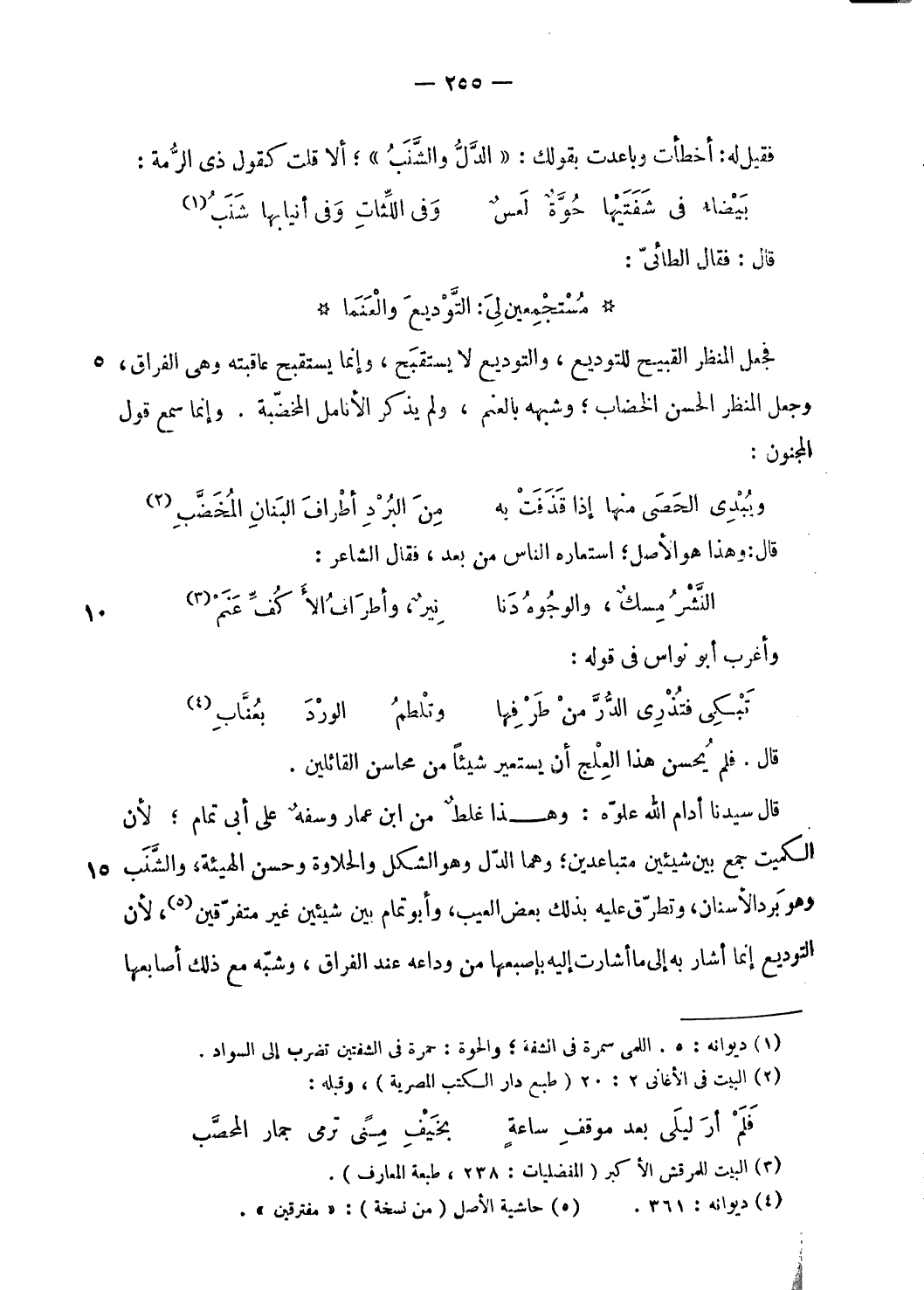 فجعل المنظر القبيح للتوديع، والتوديع لا يستقبح، وإنما يستقبح عاقبته وهى الفراق، وجعل المنظر الحسن الخضاب؛ وشبهه بالعنم، ولم يذكر الأنامل المخضّبة. وإنما سمع قول المجنون: