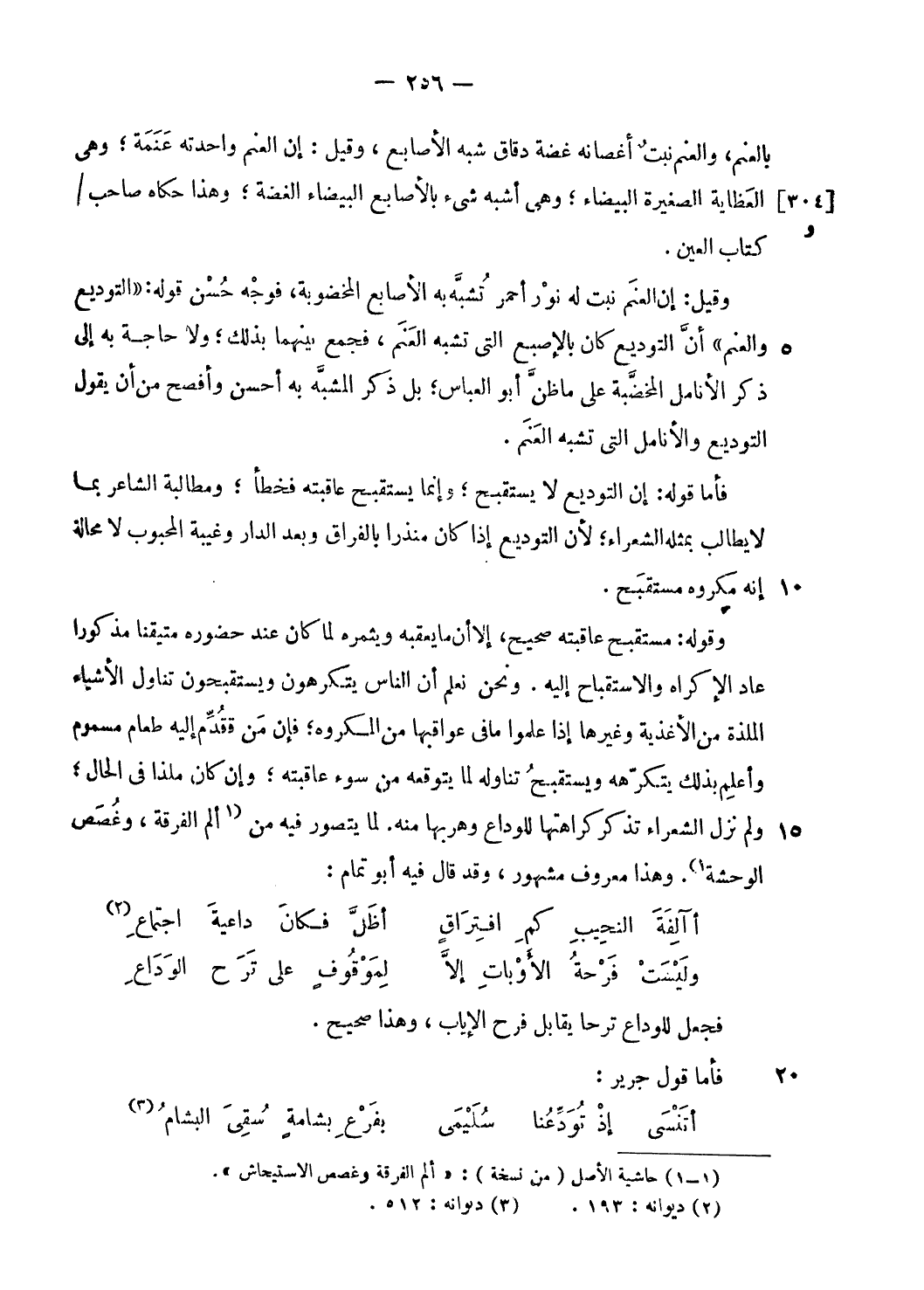 وقيل: إن العنم نبت له نور أحمر تشبّه به الأصابع المخضوبة، فوجه حسن قوله: «التوديع والعنم» أنّ التوديع كان بالإصبع التى تشبه العنم، فجمع بينهما بذلك؛ ولا حاجة به إلى ذكر الأنامل المخضّبة على ما ظنّ أبو العباس؛ بل ذكر المشبّه به أحسن وأفصح من أن يقول التوديع والأنامل التى تشبه العنم.