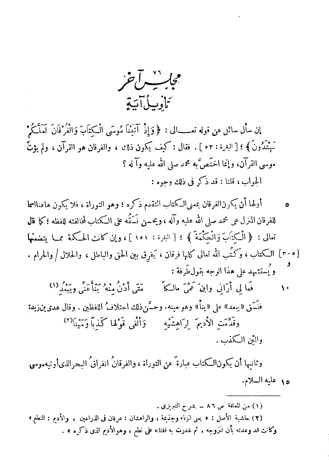 إن سأل سائل عن قوله تعالى: وَإِذْ آتَيْنا مُوسَى الْكِتابَ وَالْفُرْقانَ لَعَلَّكُمْ تَهْتَدُونَ؛ [البقرة: 53]. فقال: كيف يكون ذلك، والفرقان هو القرآن، ولم يؤت موسى القرآن، وإنما اختصّ به محمد صلى الله عليه وآله؟