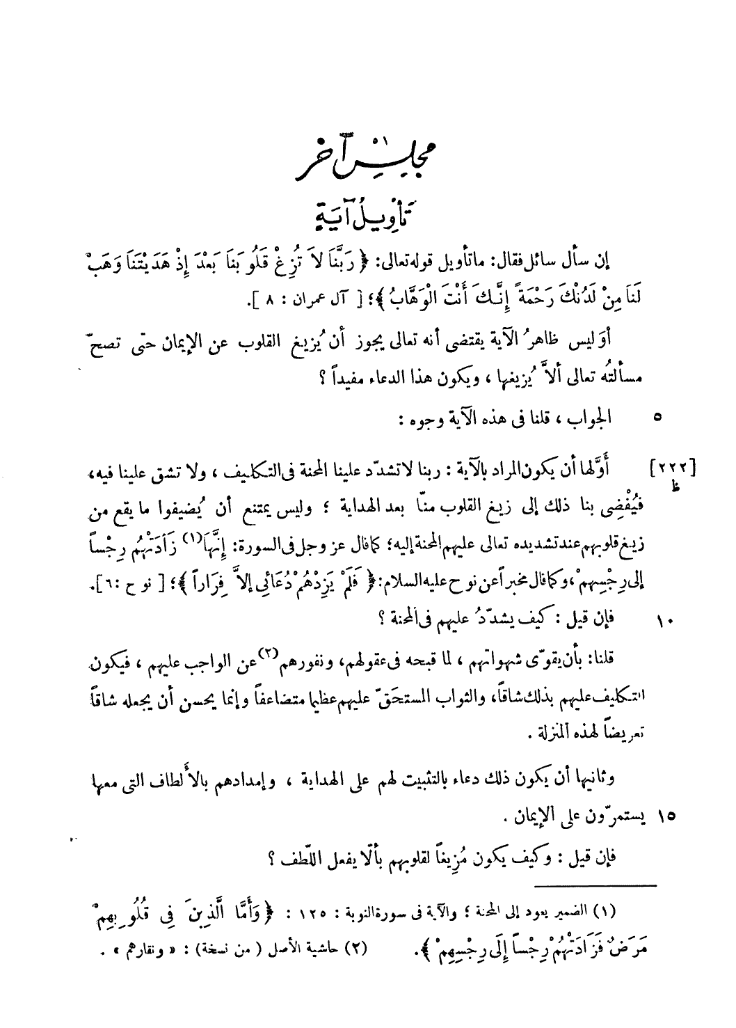 أوّلها أن يكون المراد بالآية: ربنا لا تشدّد علينا المحنة فى التكليف، ولا تشق علينا فيه، فيفضى بنا ذلك إلى زيغ القلوب منّا بعد الهداية؛ وليس يمتنع أن يضيفوا ما يقع من زيغ قلوبهم عند تشديده تعالى عليهم المحنة إليه؛ كما قال عز وجل فى السورة: إنّها (¬1) زادتهم رجسا إلى رجسهم، وكما قال مخبرا عن نوح عليه السلام: فَلَمْ يَزِدْهُمْ دُعائِي إِلَّا فِراراً؛ [نوح: 6].