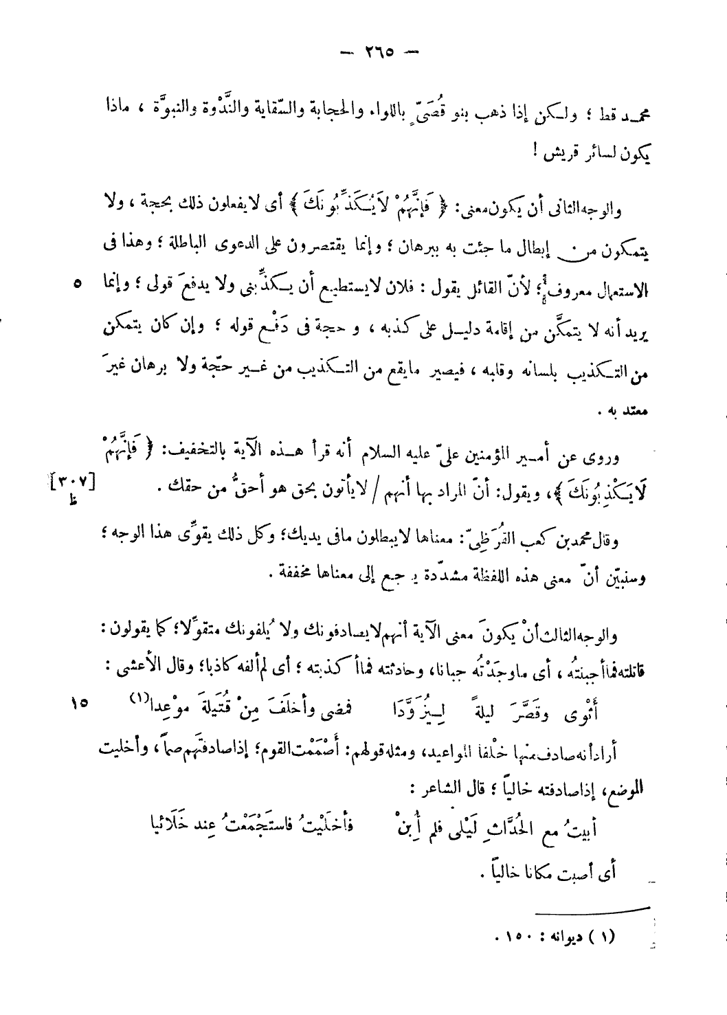 والوجه الثانى أن يكون معنى: فَإِنَّهُمْ لا يُكَذِّبُونَكَ أى لا يفعلون ذلك بحجة، ولا يتمكون من إبطال ما جئت به ببرهان؛ وإنما يقتصرون على الدعوى الباطلة؛ وهذا فى الاستعمال معروف؛ لأنّ القائل يقول: فلان لا يستطيع أن يكذّبنى ولا يدفع قولى؛ وإنما يريد أنه لا يتمكّن من إقامة دليل على كذبه، وحجة فى دفع قوله؛ وإن كان يتمكن من التكذيب بلسانه وقلبه، فيصير ما يقع من التكذيب من غير حجّة ولا برهان غير معتد به.