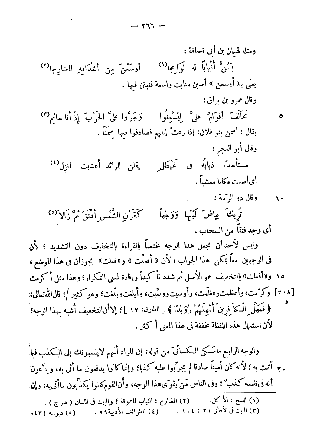 وليس لأحد أن يجعل هذا الوجه مختصا بالقراءة بالتخفيف دون التشديد؛ لأن فى الوجهين معا يمكن هذا الجواب، لأن «أفعلت» و «فعلت» يجوزان فى هذا الموضع، و «أفعلت» بالتخفيف هو الأصل ثم شدد تأكيدا وإفادة لمعنى التكرار؛ وهذا مثل أكرمت وكرّمت، وأعظمت وعظّمت، وأوصيت ووصّيت، وأبلغت وبلّغت؛ وهو كثير/؛ قال الله تعالى: