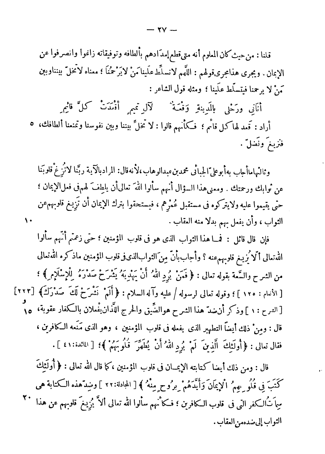 فإن قال قائل: فما هذا الثواب الّذي هو فى قلوب المؤمنين؛ حتى زعمتم أنّهم سألوا الله تعالى ألّا يزيغ قلوبهم عنه؟ وأجاب بأنّ من الثواب الّذي فى قلوب المؤمنين ما ذكره الله تعالى من الشرح والسّعة بقوله تعالى: فَمَنْ يُرِدِ اللَّهُ أَنْ يَهْدِيَهُ يَشْرَحْ صَدْرَهُ لِلْإِسْلامِ؛ [الأنعام: 125]؛ وقوله تعالى لرسوله/ عليه وآله السلام: أَلَمْ نَشْرَحْ لَكَ صَدْرَكَ [الشرح: 1] وذكر أن ضدّ هذا الشرح هو الضّيق والحرج اللّذان يفعلان بالكفار عقوبة، قال: ومن ذلك أيضا التطهير الّذي يفعله فى قلوب المؤمنين، وهو الّذي منعه الكافرين، فقال تعالى: أُولئِكَ الَّذِينَ لَمْ يُرِدِ اللَّهُ أَنْ يُطَهِّرَ قُلُوبَهُمْ؛ [المائدة: 41].