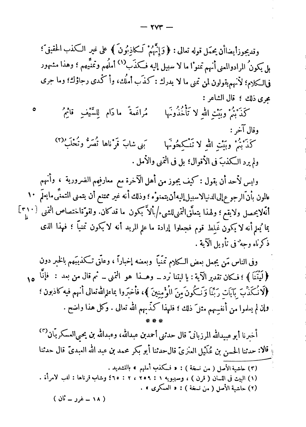 وقد يجوز أيضا أن يحمل قوله تعالى: وَإِنَّهُمْ لَكاذِبُونَ على غير الكذب الحقيقىّ؛ بل يكون المراد والمعنى أنهم تمنوا ما لا سبيل إليه فكذب (¬1) أملهم وتمنّيهم؛ وهذا مشهور فى الكلام؛ لأنهم يقولون لمن تمنى ما لا يدرك: كذب أملك، وأكدى رجاؤك؛ وما جرى مجرى ذلك؛ قال الشاعر: