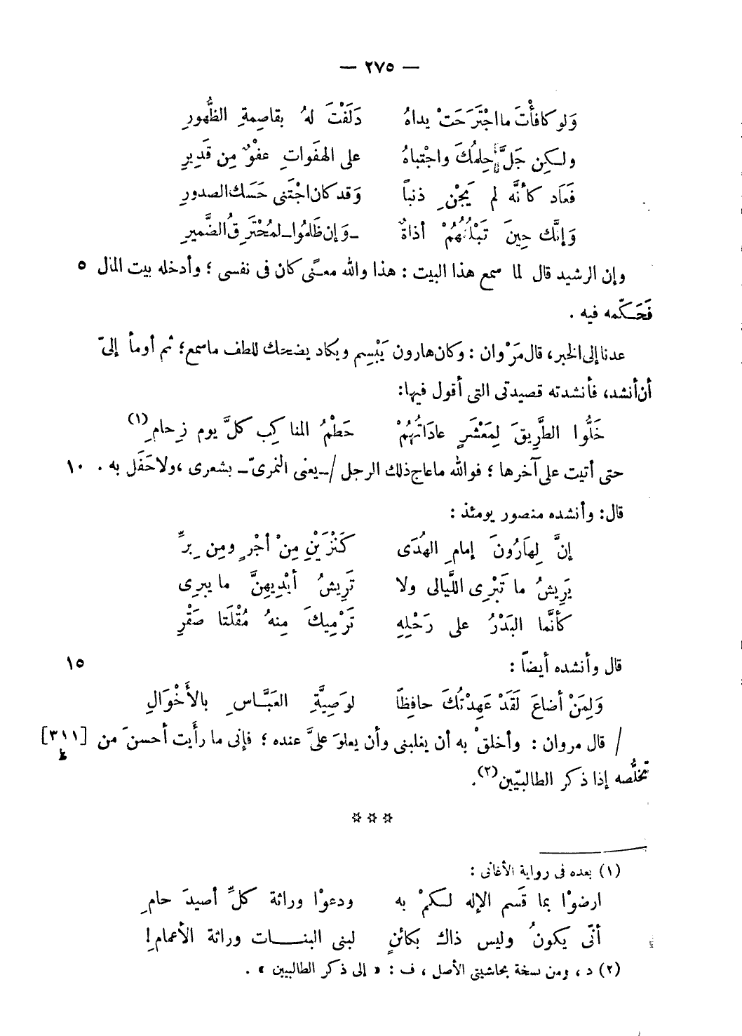 عدنا إلى الخبر، قال مروان: وكان هارون يبسم ويكاد يضحك للطف ما سمع؛ ثم أومأ إلى أن أنشد، فأنشدته قصيدتى التى أقول فيها: