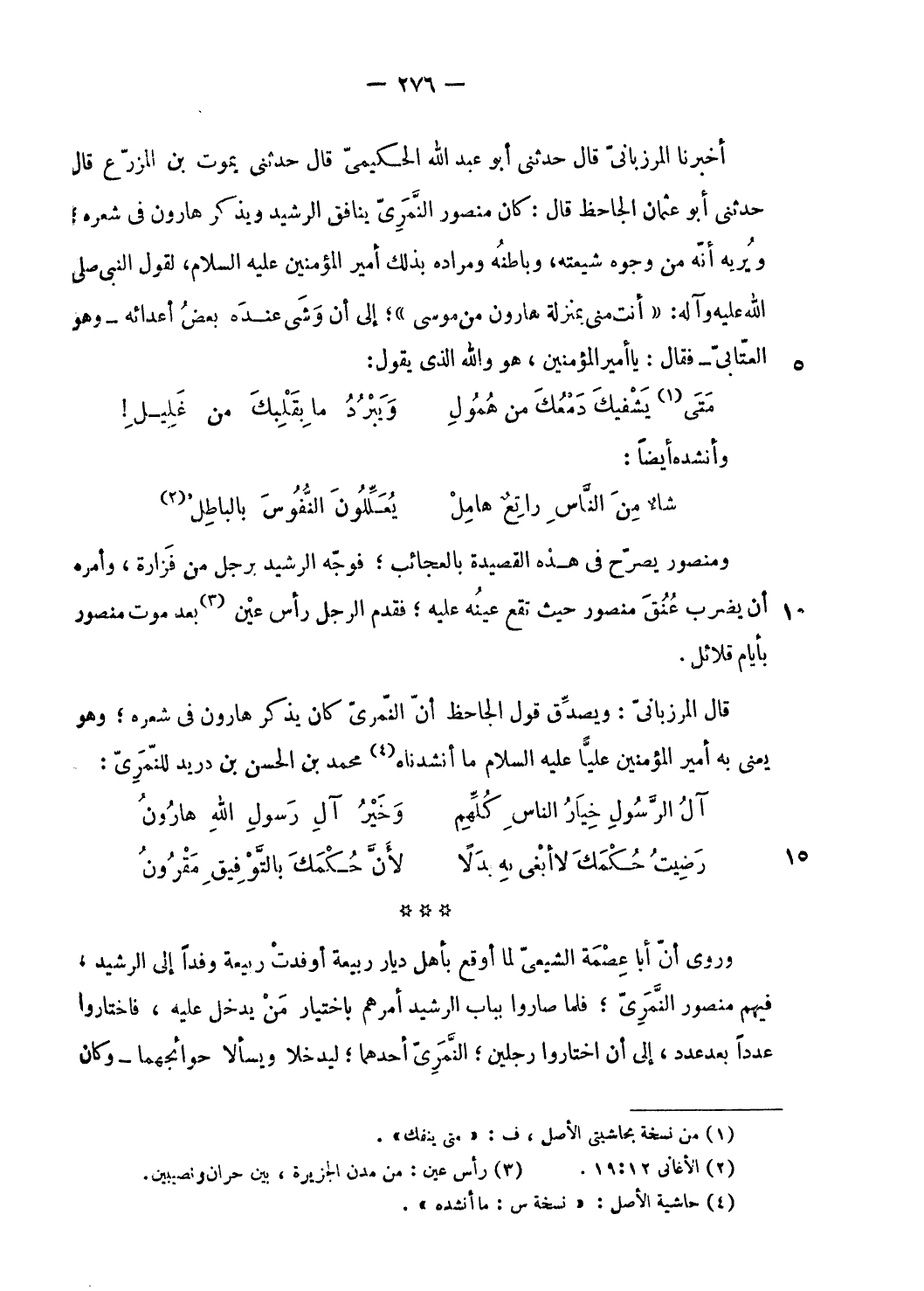أخبرنا المرزبانىّ قال حدثنى أبو عبد الله الحكيمىّ قال حدثنى يموت بن المزرّع قال حدثنى أبو عثمان الجاحظ قال: كان منصور النّمرىّ ينافق الرشيد ويذكر هارون فى شعره؛ ويريه أنّه من وجوه شيعته، وباطنه ومراده بذلك أمير المؤمنين عليه السلام، لقول النبي صلى الله عليه وآله: «أنت منى بمنزلة هارون من موسى»؛ إلى أن وشى عنده بعض أعدائه- وهو العتّابىّ- فقال: يا أمير المؤمنين، هو والله الّذي يقول:
