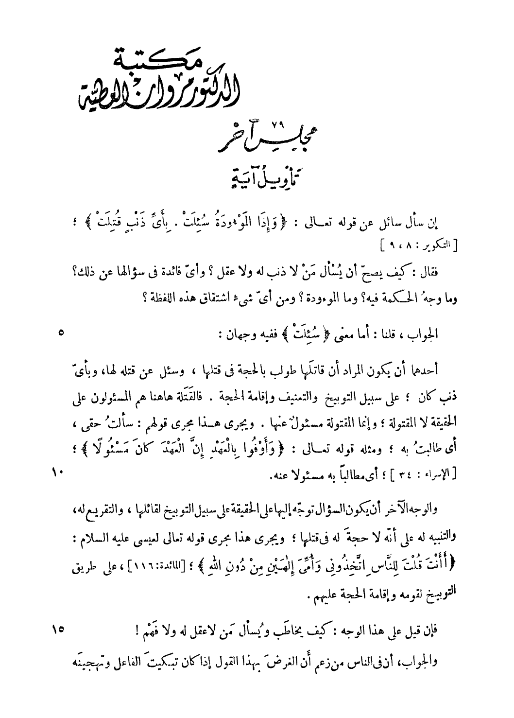 والتعنيف وإقامة الحجة. فالقتلة هاهنا هم المسئولون على الحقيقة لا المقتولة؛ وإنما المقتولة مسئول عنها. ويجرى هذا مجرى قولهم: سألت حقى، أى طالبت به؛ ومثله قوله تعالى: وَأَوْفُوا بِالْعَهْدِ إِنَّ الْعَهْدَ كانَ مَسْؤُلًا؛ [الإسراء: 34]؛ أى مطالبا به مسئولا عنه.