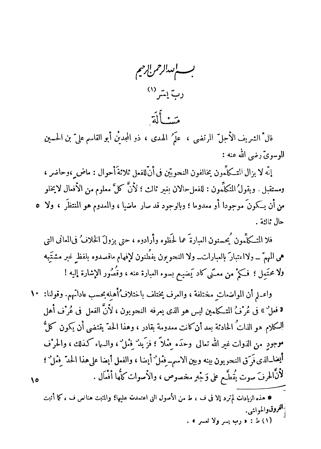«فعل» فى عرف المتكلمين ليس هو الّذي يعرفه النحويون، لأنّ الفعل فى عرف أهل الكلام هو الذات الحادثة بعد أن