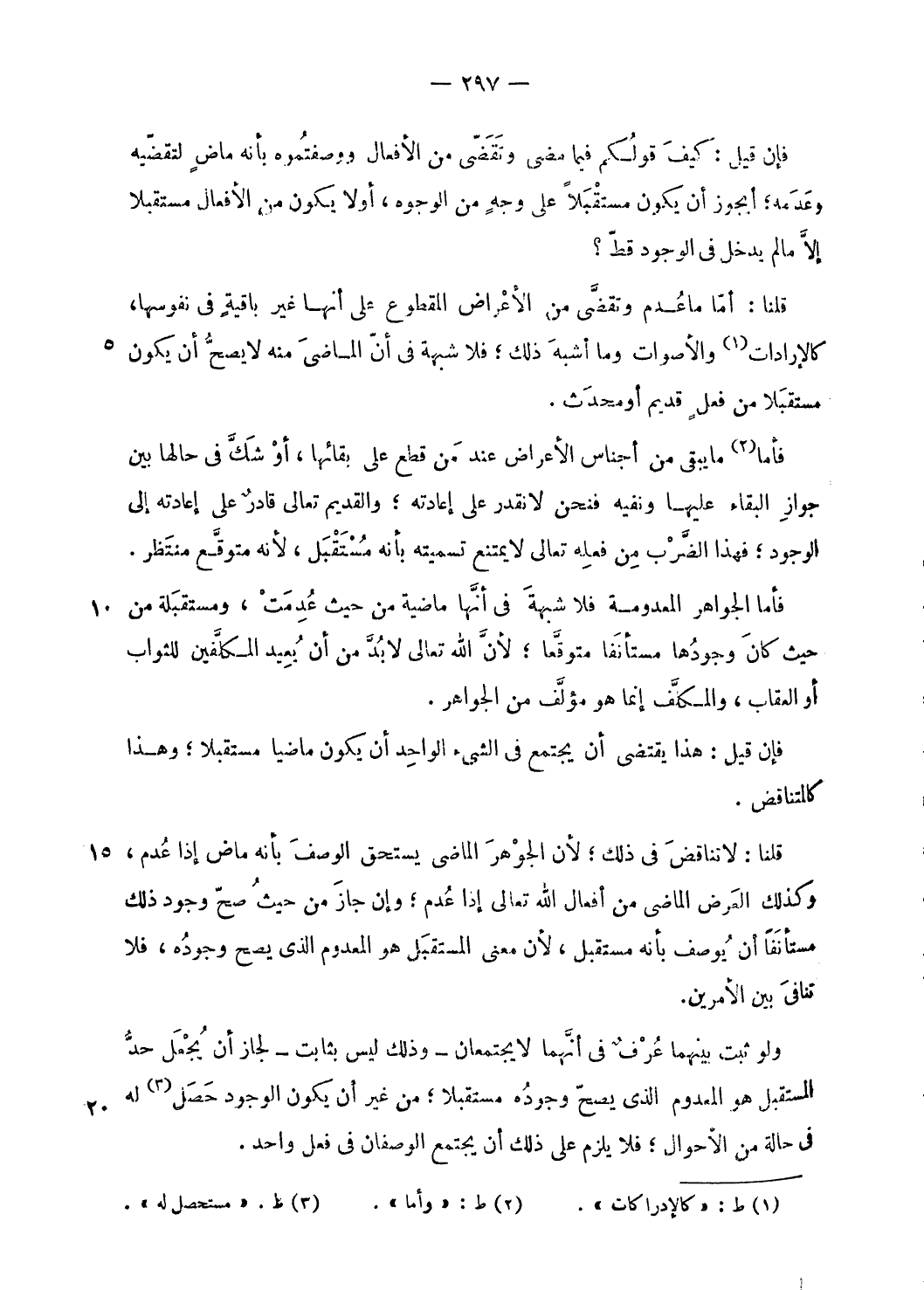 فأما الجواهر المعدومة فلا شبهة فى أنّها ماضية من حيث عدمت، ومستقبلة من حيث كان وجودها مستأنفا متوقّعا؛ لأنّ الله تعالى لا بدّ من أن يعيد المكلّفين للثواب أو العقاب، والمكلّف إنما هو مؤلّف من الجواهر.