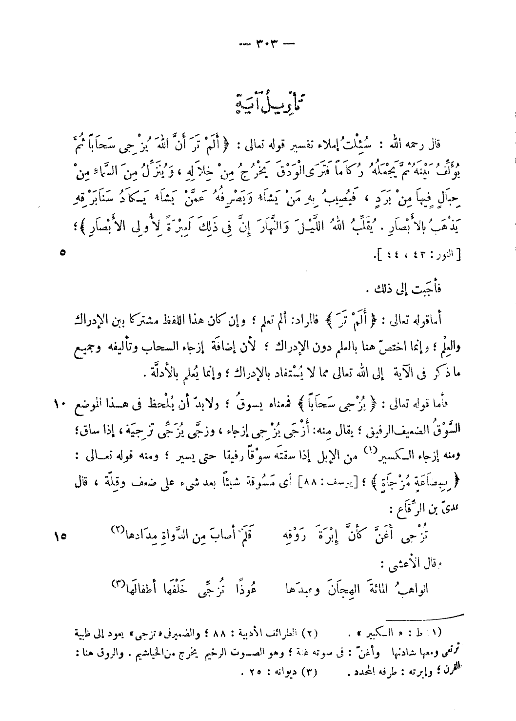 قال رحمه الله: سئلت إملاء تفسير قوله تعالى: أَلَمْ تَرَ أَنَّ اللَّهَ يُزْجِي سَحاباً ثُمَّ يُؤَلِّفُ بَيْنَهُ ثُمَّ يَجْعَلُهُ رُكاماً فَتَرَى الْوَدْقَ يَخْرُجُ مِنْ خِلالِهِ، وَيُنَزِّلُ مِنَ السَّماءِ مِنْ جِبالٍ فِيها مِنْ بَرَدٍ، فَيُصِيبُ بِهِ مَنْ يَشاءُ وَيَصْرِفُهُ عَنْ مَنْ يَشاءُ يَكادُ سَنا بَرْقِهِ يَذْهَبُ بِالْأَبْصارِ. يُقَلِّبُ اللَّهُ اللَّيْلَ وَالنَّهارَ إِنَّ فِي ذلِكَ لَعِبْرَةً لِأُولِي الْأَبْصارِ؛ [النور: 43، 44].