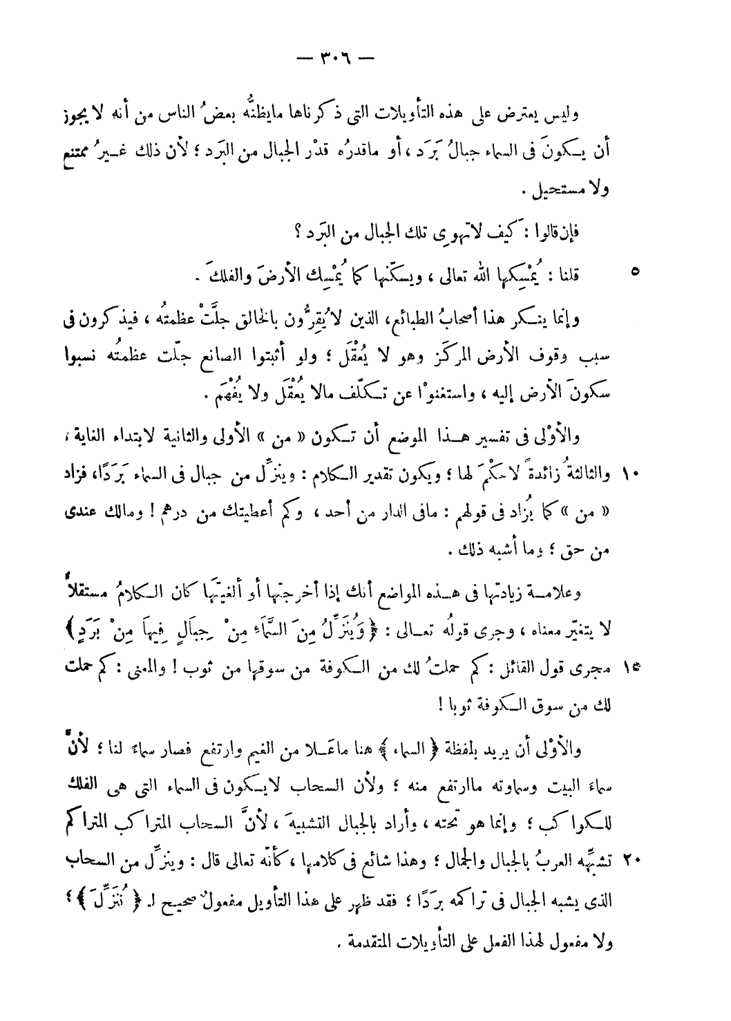 وليس يعترض على هذه التأويلات التى ذكرناها ما يظنّه بعض الناس من أنه لا يجوز أن يكون فى السماء جبال برد، أو ما قدره قدر الجبال من البرد؛ لأن ذلك غير ممتنع ولا مستحيل.