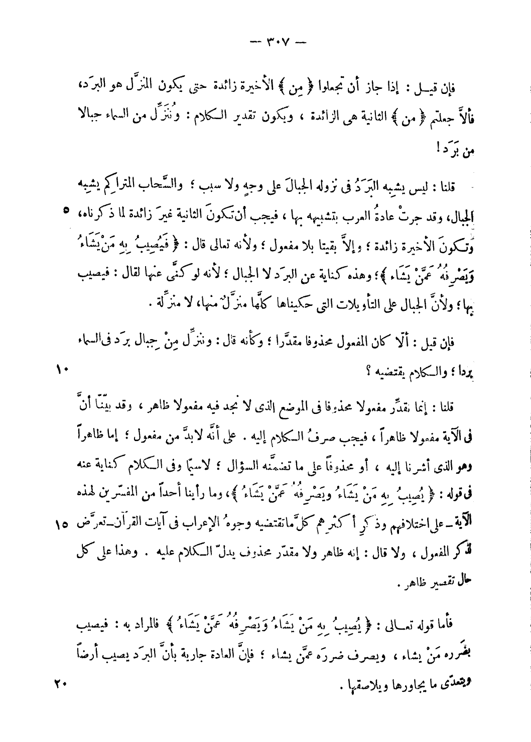 قلنا: ليس يشبه البرد فى نزوله الجبال على وجه ولا سبب؛ والسّحاب المتراكم يشبه الجبال، وقد جرت عادة العرب بتشبيهه بها، فيجب أن تكون الثانية غير زائدة لما ذكرناه، وتكون الأخيرة زائدة؛ وإلّا بقيتا بلا مفعول؛ ولأنه تعالى قال: فَيُصِيبُ بِهِ مَنْ يَشاءُ وَيَصْرِفُهُ عَنْ مَنْ يَشاءُ؛ وهذه كناية عن البرد لا الجبال؛ لأنه لو كنّى عنها لقال: فيصيب بها؛ ولأنّ الجبال على التأويلات التى حكيناها كلّها منزّل منها، لا منزّلة.