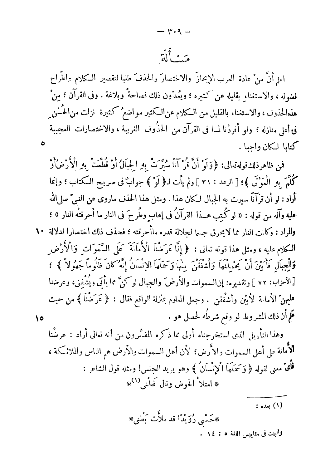 اعلم أنّ من عادة العرب الإيجاز والاختصار والحذف طلبا لتقصير الكلام واطّراح فضوله، والاستغناء بقليله عن كثيره؛ ويعدّون ذلك فصاحة وبلاغة. وفى القرآن؛ من هذه الحذوف، والاستغناء بالقليل من الكلام عن الكثير مواضع كثيرة نزلت من الحسن فى أعلى منازله؛ ولو أفردنا لما فى القرآن من الحذوف الغريبة، والاختصارات العجيبة كتابا لكان واجبا.