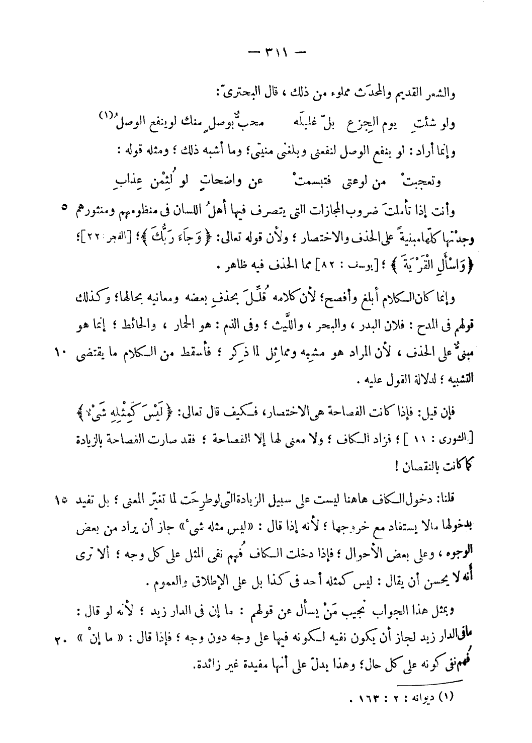 وأنت إذا تأملت ضروب المجازات التى يتصرف فيها أهل اللسان فى منظومهم ومنثورهم وجدتها كلّها مبنية على الحذف والاختصار؛ ولأن قوله تعالى: وَجاءَ رَبُّكَ؛ [الفجر: 22]؛ وَسْئَلِ الْقَرْيَةَ؛ [يوسف: 82] مما الحذف فيه ظاهر.