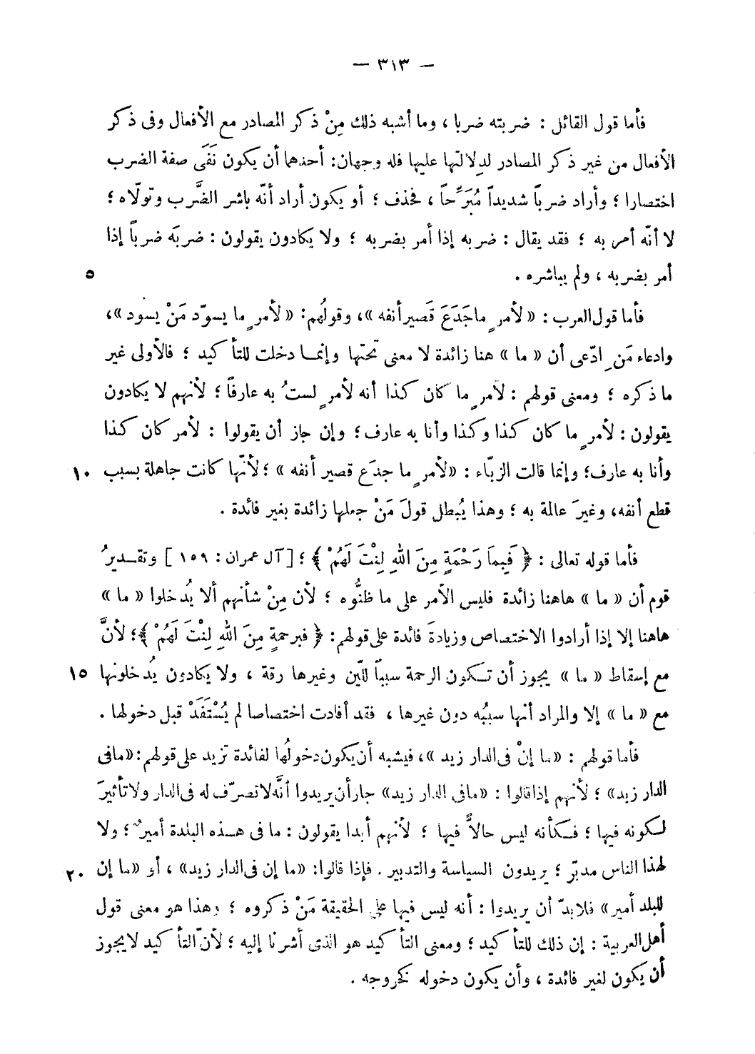 فأما قولهم: «ما إن فى الدار زيد»، فيشبه أن يكون دخولها لفائدة تزيد على قولهم: «ما فى الدار زيد»؛ لأنهم إذا قالوا: «ما فى الدار زيد» جاز أن يريدوا أنّه لا تصرّف له فى الدار ولا تأثير لكونه فيها؛ فكأنه ليس حالّا فيها؛ لأنهم أبدا يقولون: ما فى هذه البلدة أمير؛ ولا لهذا الناس مدبّر؛ يريدون السياسة والتدبير. فإذا قالوا: «ما إن فى الدار زيد»، أو «ما إن للبلد أمير» فلا بدّ أن يريدوا: أنه ليس فيها على الحقيقة من ذكروه؛ وهذا هو معنى قول أهل العربية: إن ذلك للتأكيد؛ ومعنى التأكيد هو الّذي أشرنا إليه؛ لأنّ التأكيد لا يجوز أن يكون لغير فائدة، وأن يكون دخوله كخروجه.
