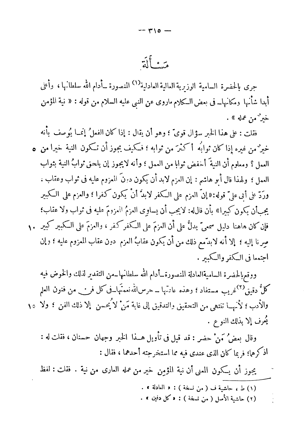 جرى بالحضرة السامية الوزيرية العالية العادلية (¬1) المنصورة- أدام الله سلطانها، وأعلى أبدا شأنها ومكانها- فى بعض الكلام ما روى عن النبي عليه السلام من قوله: «نية المؤمن خير من عمله».