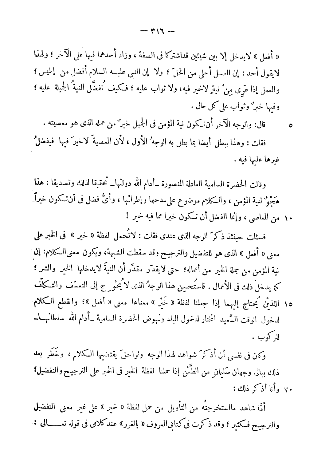فسئلت حينئذ ذكر الوجه الّذي عندى فقلت: لا تحمل لفظة «خير» فى الخبر على معنى «أفعل» الّذي هو للتفضيل والترجيح وقد سقطت الشبهة، ويكون معنى الكلام: إن نية المؤمن من جملة الخير من أعماله؛ حتى لا يقدّر مقدّر أن النية لا يدخلها الخير والشر؛ كما يدخل ذلك فى الأعمال. فاستحسن هذا الوجه الّذي لا يحوج إلى التعسّف والتكلّف اللذين يحتاج إليهما إذا جعلنا لفظة «خير» معناها معنى «أفعل»؛ وانقطع الكلام لدخول الوقت السّعيد المختار لدخول البلد ونهوض الحضرة السامية- أدام الله سلطانها- للركوب.