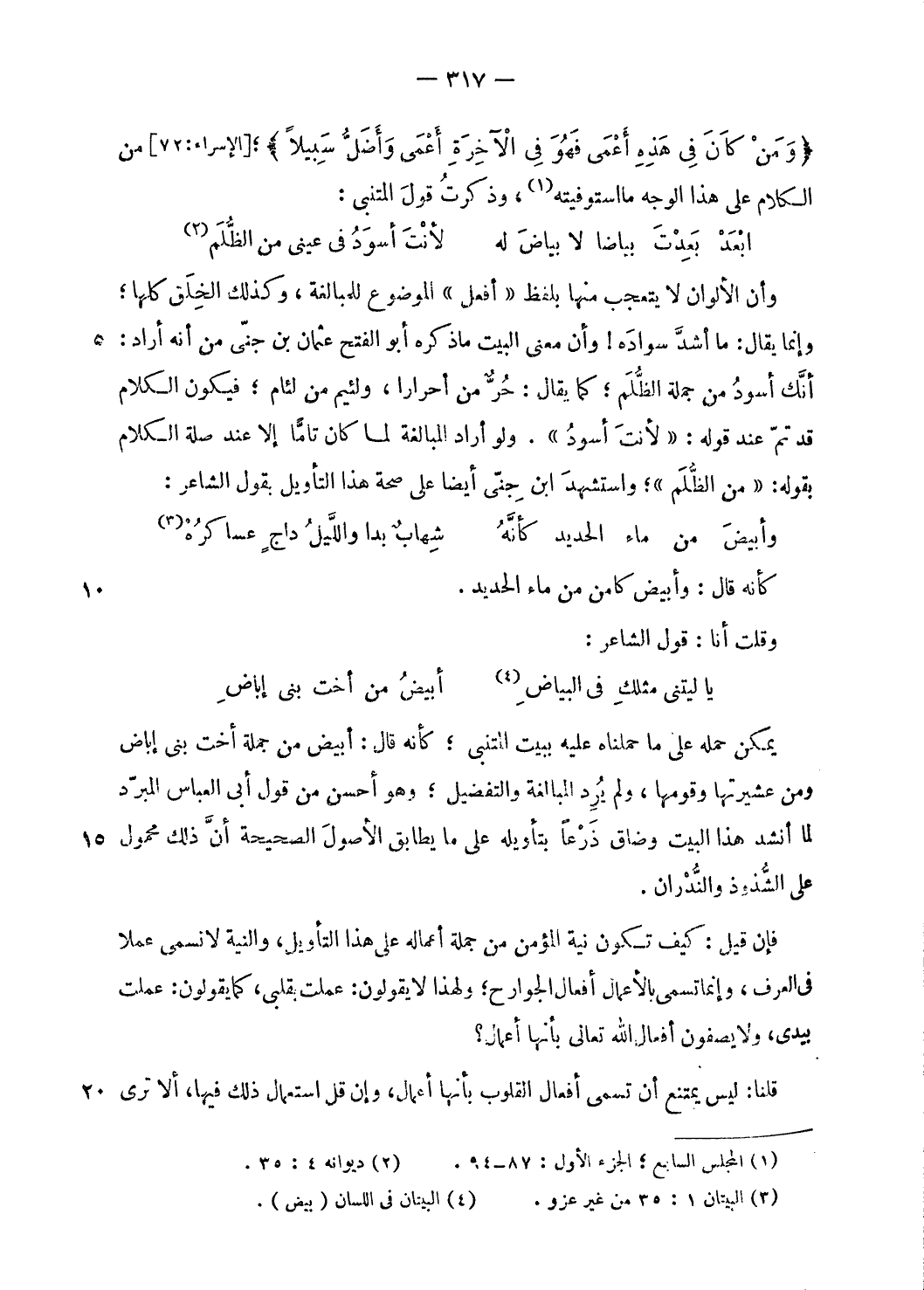 وَمَنْ كانَ فِي هذِهِ أَعْمى فَهُوَ فِي الْآخِرَةِ أَعْمى وَأَضَلُّ سَبِيلًا؛ [الإسراء: 72] من الكلام على هذا الوجه ما استوفيته (¬1)، وذكرت قول المتنبى: