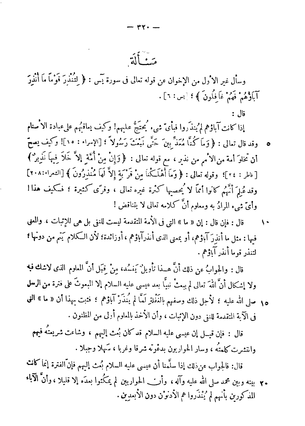 قال: والجواب عن ذلك أنّ هذا تأويل يفسد، من قبل أنّ المعلوم الّذي لا شك فيه ولا إشكال أنّ الله تعالى لم يبعث نبيّا بعد عيسى عليه السلام إلا المبعوث على فترة من الرسل صلى الله عليه؛ لأجل ذلك وصفهم بالغفلة لمّا لم ينذر آباؤهم؛ فثبت بهذا أن «ما» التى فى الآية المتقدمة للنفى دون الإثبات، وأن الأخذ بالمعلوم أولى من المظنون.