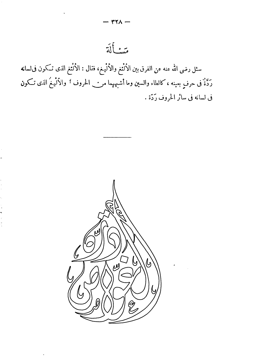 سئل رضى الله عنه عن الفرق بين الألثغ والأليغ، فقال: الألثغ الّذي تكون فى لسانه ردّة فى حرف بعينه، كالطاء والسين وما أشبههما من الحروف؛ والأليغ الّذي تكون فى لسانه فى سائر الحروف ردّة.