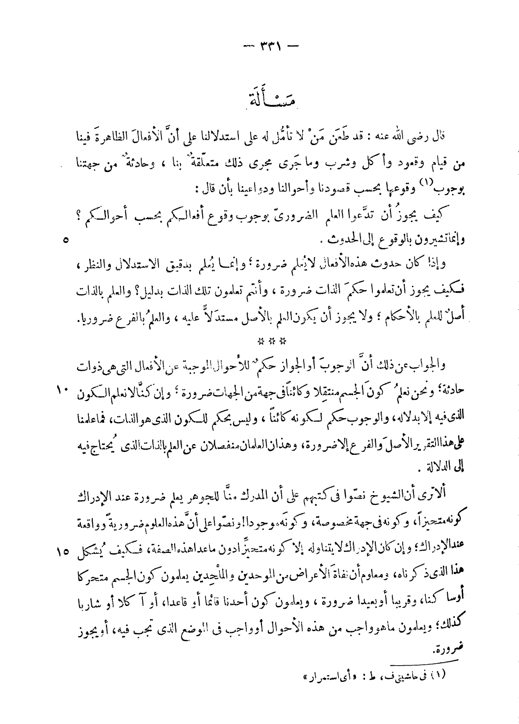 *** والجواب عن ذلك أنّ الوجوب أو الجواز حكم للأحوال الموجبة عن الأفعال التى هى ذوات حادثة؛ ونحن نعلم كون الجسم منتقلا وكائنا فى جهة من الجهات ضرورة؛ وإن كنّا لا نعلم الكون الّذي فيه إلا بدلالة، والوجوب حكم لكونه كائنا، وليس بحكم للكون الّذي هو الذات، فما علمنا على هذا التقرير الأصل والفرع إلا ضرورة، وهذان