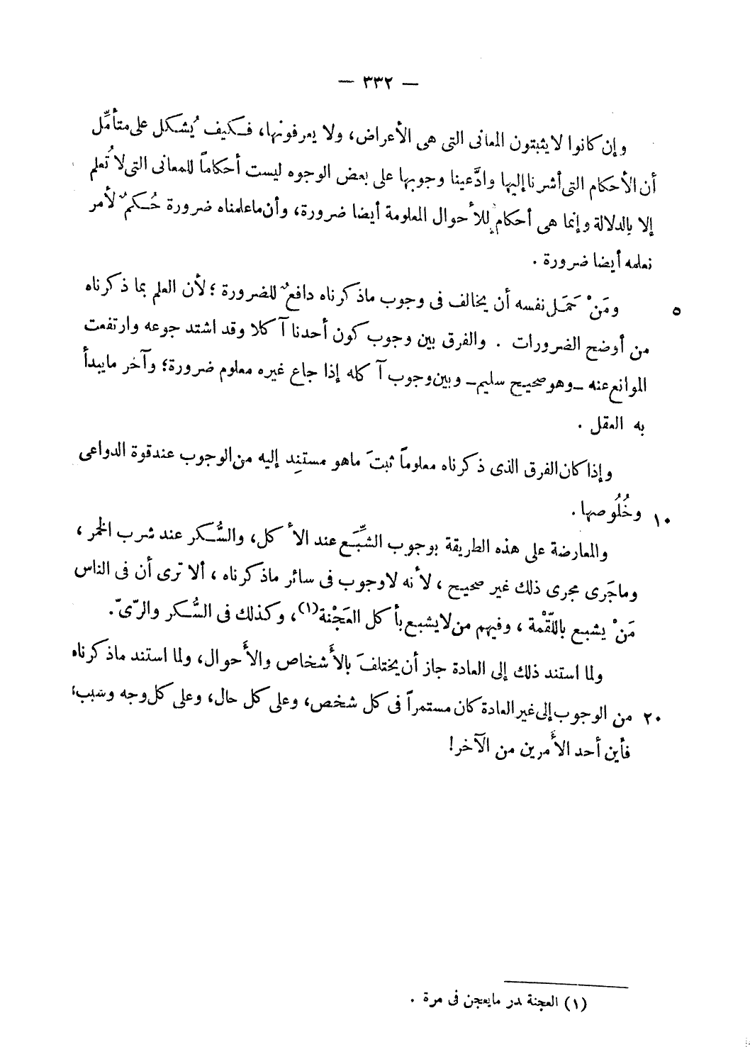 والمعارضة على هذه الطريقة بوجوب الشّبع عند الأكل، والسّكر عند شرب الخمر، وما جرى مجرى ذلك غير صحيح، لأنه لا وجوب فى سائر ما ذكرناه، ألا ترى أن فى الناس من يشبع باللّقمة، وفيهم من لا يشبع بأكل العجنة (¬1)، وكذلك فى السّكر والرّىّ.