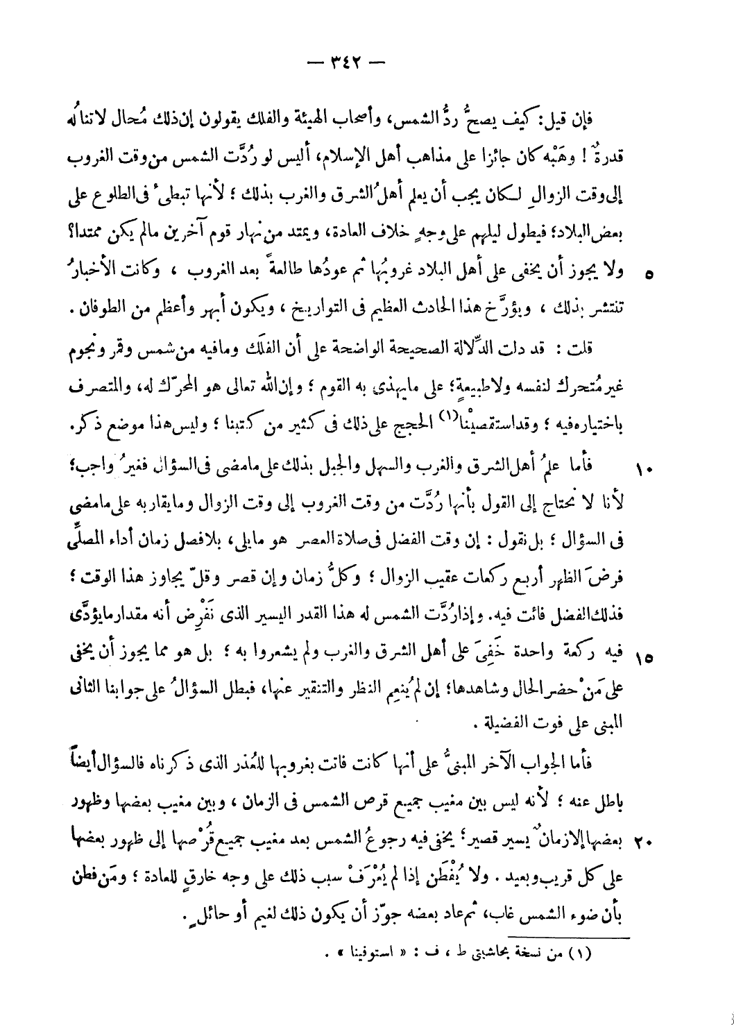 قلت: قد دلت الدّلالة الصحيحة الواضحة على أن الفلك وما فيه من شمس وقمر ونجوم غير متحرك لنفسه ولا طبيعة؛ على ما يهذى به القوم؛ وإن الله تعالى هو المحرّك له، والمتصرف باختياره فيه؛ وقد استقصينا (¬1) الحجج على ذلك فى كثير من كتبنا؛ وليس هذا موضع ذكر.
