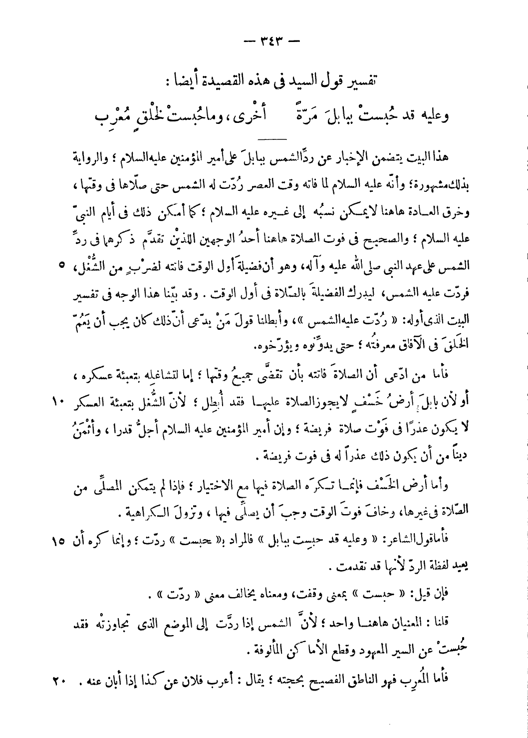 هذا البيت يتضمن الإخبار عن ردّ الشمس ببابل على أمير المؤمنين عليه السلام؛ والرواية بذلك مشهورة؛ وأنّه عليه السلام لما فاته وقت العصر ردّت له الشمس حتى صلّاها فى وقتها، وخرق العادة هاهنا لا يمكن نسبه إلى غيره عليه السلام؛ كما أمكن ذلك فى أيام النبىّ عليه السلام؛ والصحيح فى فوت الصلاة هاهنا أحد الوجهين اللذين