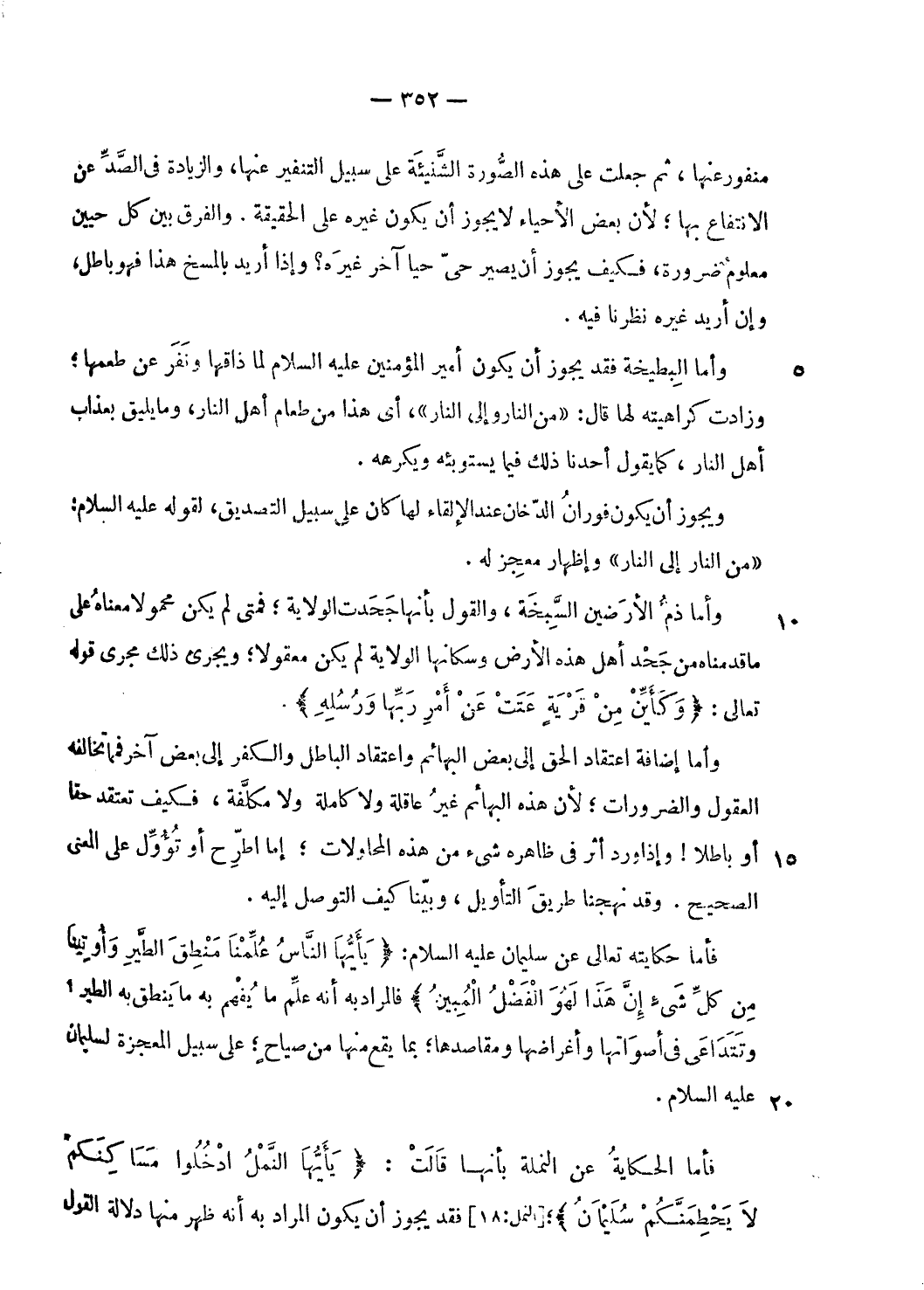 فأما حكايته تعالى عن سليمان عليه السلام: يا أَيُّهَا النَّاسُ عُلِّمْنا مَنْطِقَ الطَّيْرِ وَأُوتِينا مِنْ كُلِّ شَيْءٍ إِنَّ هذا لَهُوَ الْفَضْلُ الْمُبِينُ فالمراد به أنه علّم ما يفهم به ما ينطق به الطير؛ وتتداعى فى أصواتها وأغراضها ومقاصدها؛ بما يقع منها من صياح؛ على سبيل المعجزة لسليمان عليه السلام.