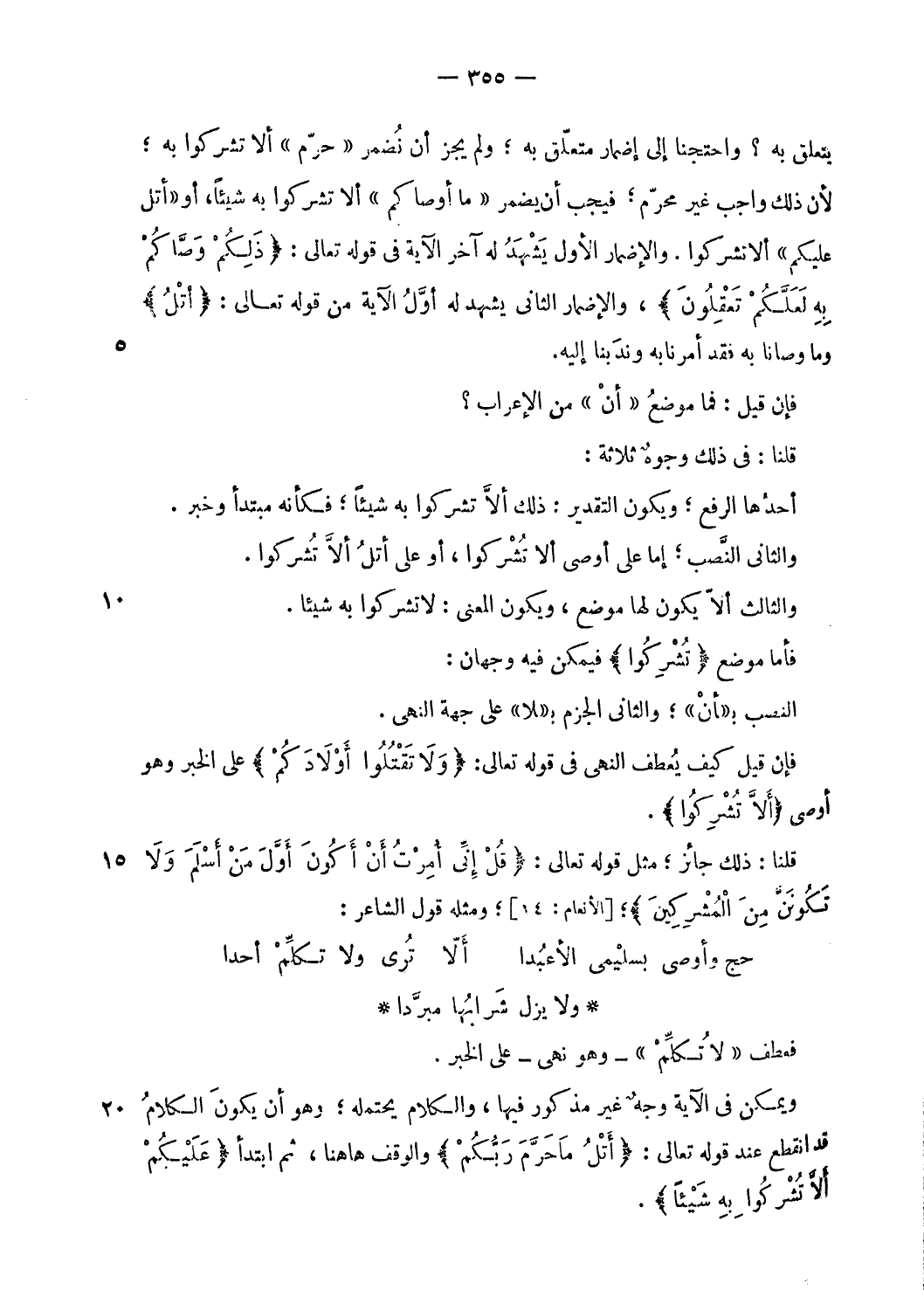 ويمكن فى الآية وجه غير مذكور فيها، والكلام يحتمله؛ وهو أن يكون الكلام قد انقطع عند قوله تعالى: أَتْلُ ما حَرَّمَ رَبُّكُمْ والوقف هاهنا، ثم ابتدأ عَلَيْكُمْ أَلَّا تُشْرِكُوا بِهِ شَيْئاً.