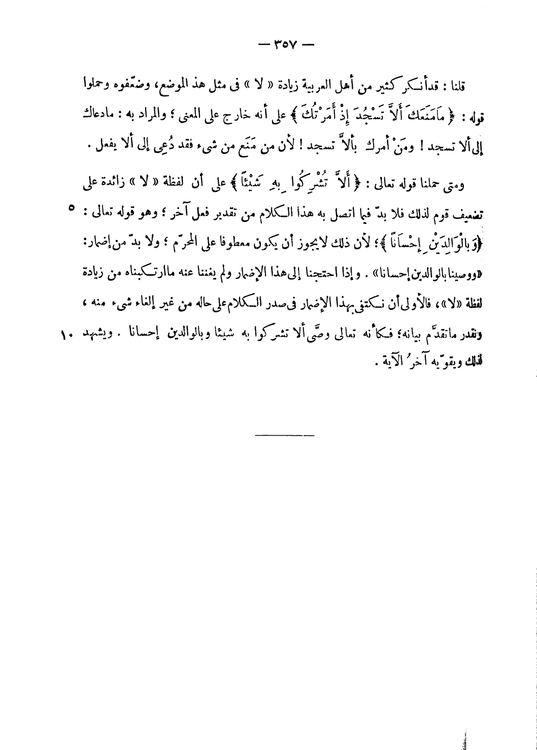 «ووصينا بالوالدين إحسانا». وإذا احتجنا إلى هذا الإضمار ولم يغننا عنه ما ارتكبناه من زيادة لفظة «لا»، فالأولى أن نكتفى بهذا الإضمار فى صدر الكلام على حاله من غير إلغاء شيء منه، ونقدر ما تقدّم بيانه؛ فكأنه تعالى وصّى ألا تشركوا به شيئا وبالوالدين إحسانا. ويشهد لذلك ويقوّيه آخر الآية.
