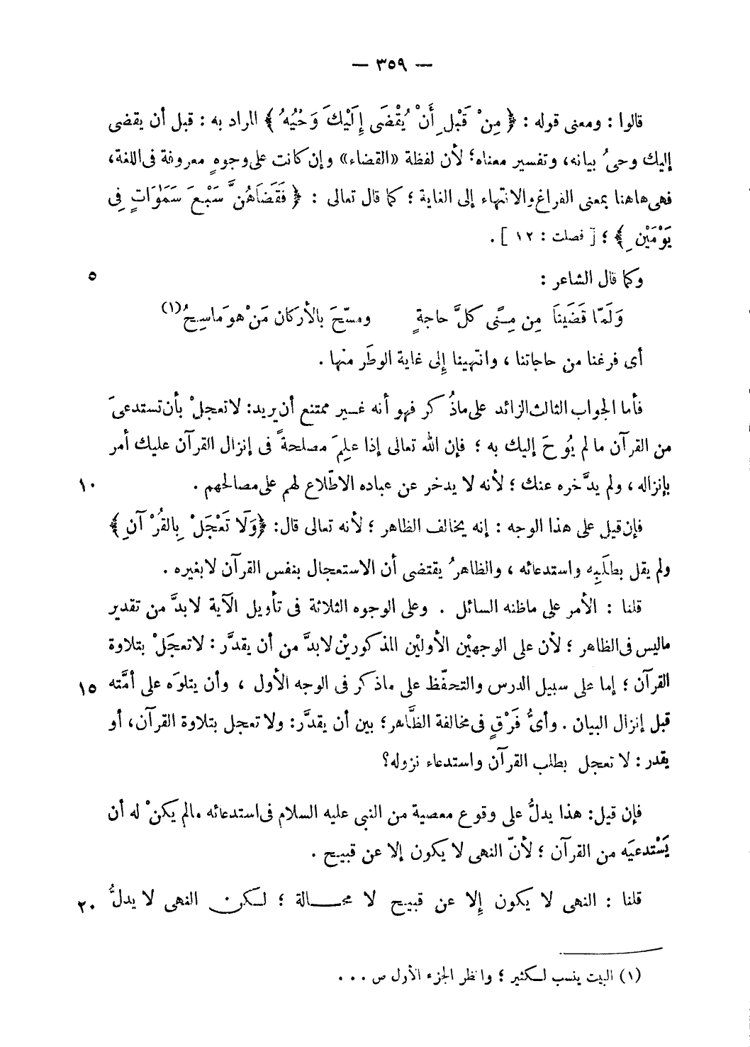 قلنا: الأمر على ما ظنه السائل. وعلى الوجوه الثلاثة فى تأويل الآية لا بدّ من تقدير ما ليس فى الظاهر؛ لأن على الوجهين الأولين المذكورين لا بدّ من أن يقدّر: لا تعجل بتلاوة القرآن؛ إما على سبيل الدرس والتحفّظ على ما ذكر فى الوجه الأول، وأن يتلوه على أمّته قبل إنزال البيان. وأىّ فرق فى مخالفة الظّاهر؛ بين أن يقدّر: ولا تعجل بتلاوة القرآن، أو يقدر: لا تعجل بطلب القرآن واستدعاء نزوله؟