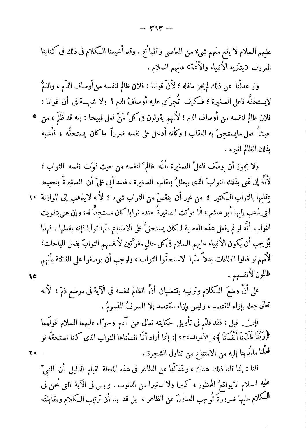 ولو عدلنا عن ذلك لم يجز ما قاله؛ لأنّ قولنا: فلان ظالم لنفسه من أوصاف الذمّ، والذمّ لا يستحقّه فاعل الصغيرة؛ فكيف تجرى عليه أوصاف الذم؟ ولا شبهة فى أن قولنا: