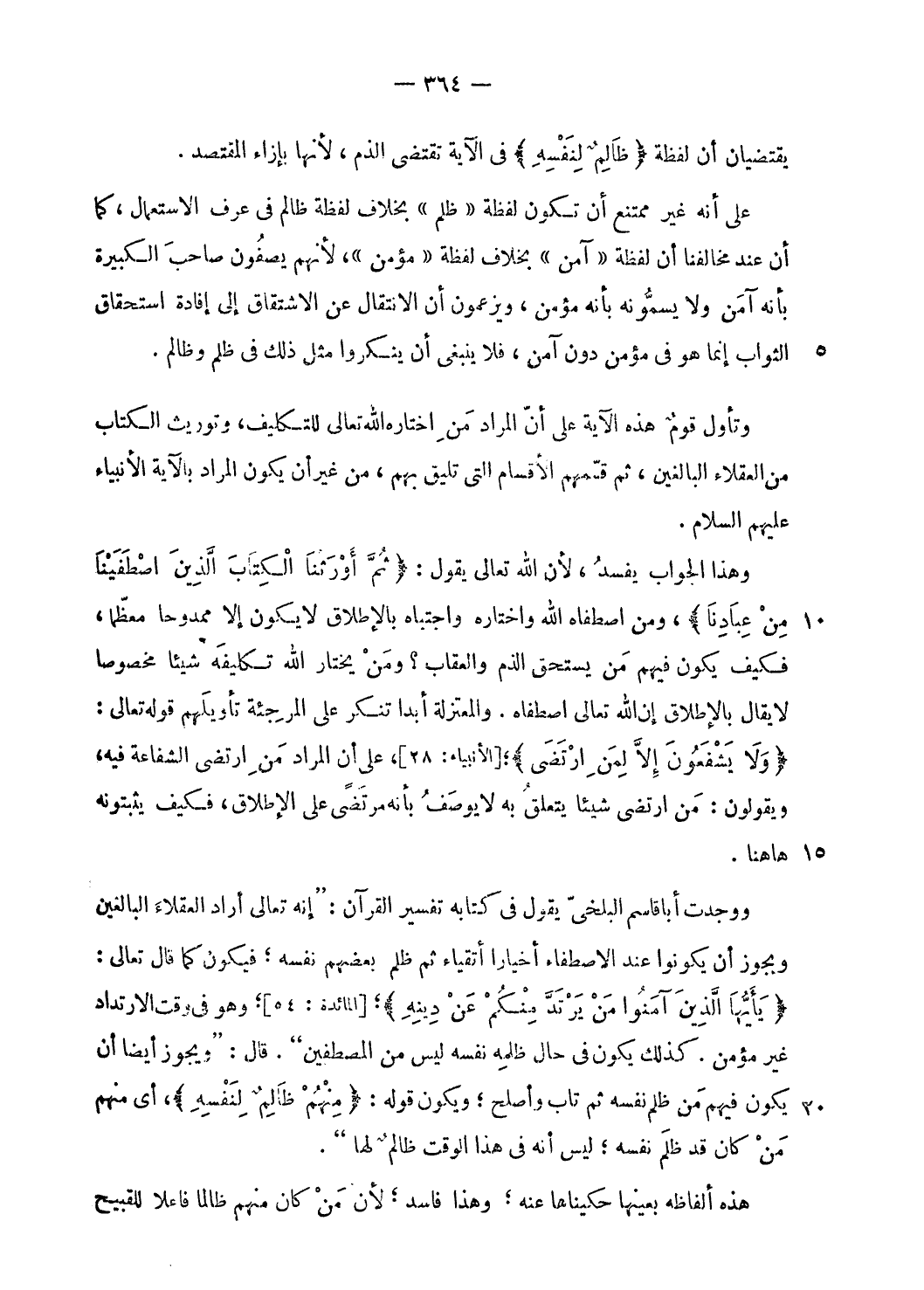 ووجدت أبا قاسم البلخىّ يقول فى كتابه تفسير القرآن: " إنه تعالى أراد العقلاء البالغين ويجوز أن يكونوا عند الاصطفاء أخيارا أتقياء ثم ظلم بعضهم نفسه؛ فيكون كما قال تعالى: