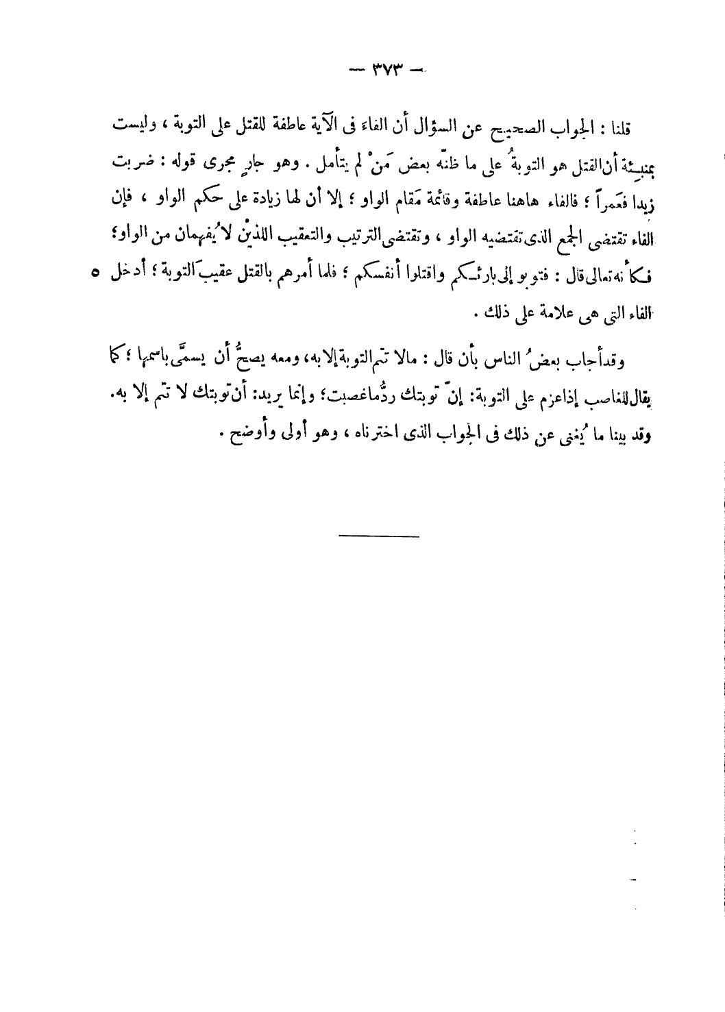 قلنا: الجواب الصحيح عن السؤال أن الفاء فى الآية عاطفة للقتل على التوبة، وليست بمنبئة أن القتل هو التوبة على ما ظنّه بعض من لم يتأمل. وهو جار مجرى قوله: ضربت زيدا فعمرا؛ فالفاء هاهنا عاطفة وقائمة مقام الواو؛ إلا أن لها زيادة على حكم الواو، فإن الفاء تقتضى الجمع الّذي تقتضيه الواو، وتقتضى الترتيب والتعقيب اللذين لا يفهمان من الواو؛ فكأنه تعالى قال: فتوبوا إلى بارئكم واقتلوا أنفسكم؛ فلما أمرهم بالقتل عقيب التوبة؛ أدخل الفاء التى هى علامة على ذلك.