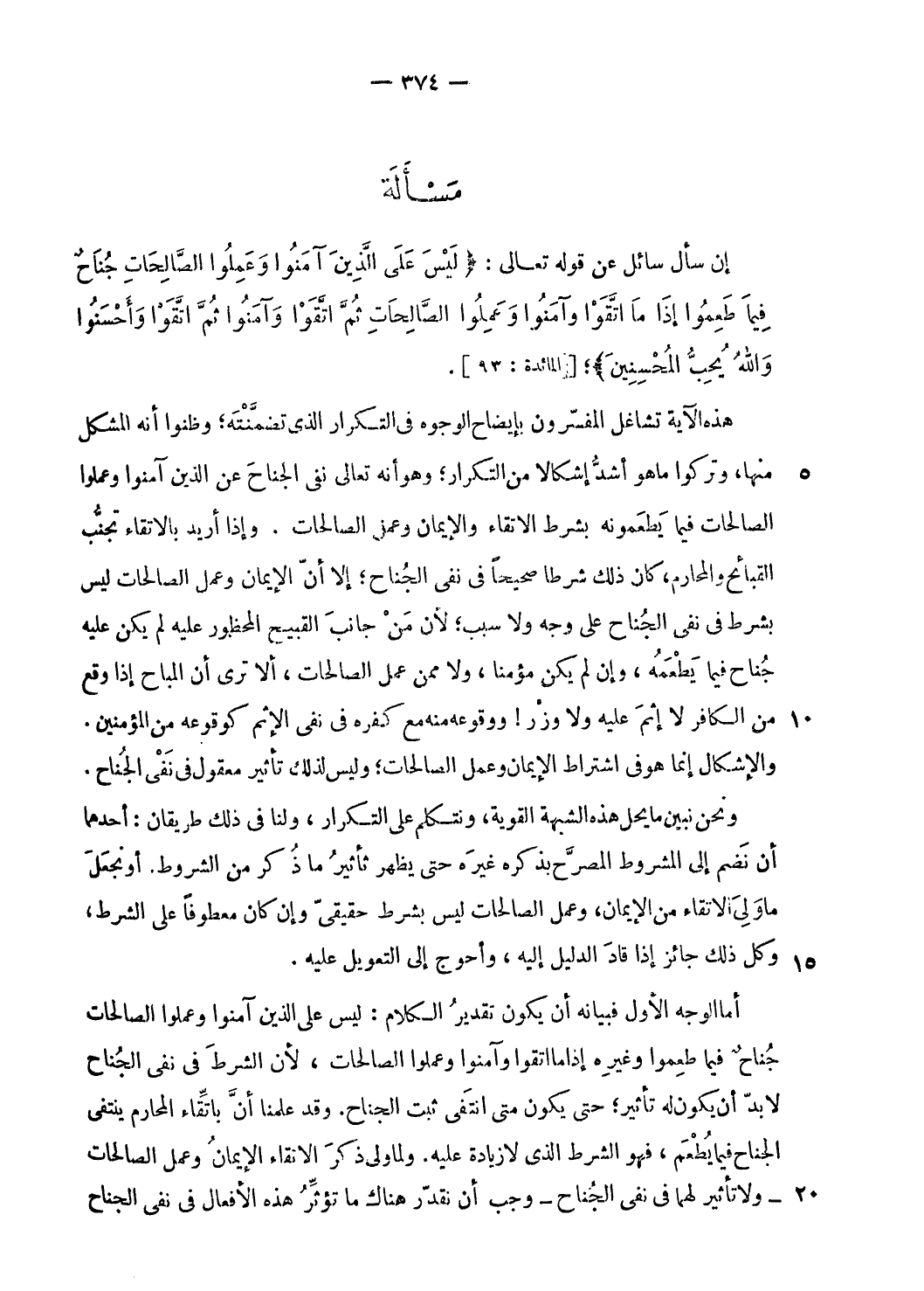 ونحن نبين ما يحل هذه الشبهة القوية، ونتكلم على التكرار، ولنا فى ذلك طريقان: أحدهما أن نضم إلى المشروط المصرّح بذكره غيره حتى يظهر تأثير ما ذكره من الشروط. أو نجعل ما ولى الاتقاء من الإيمان، وعمل الصالحات ليس بشرط حقيقىّ وإن كان معطوفا على الشرط، وكل ذلك جائز إذا قاد الدليل إليه، وأحوج إلى التعويل عليه.