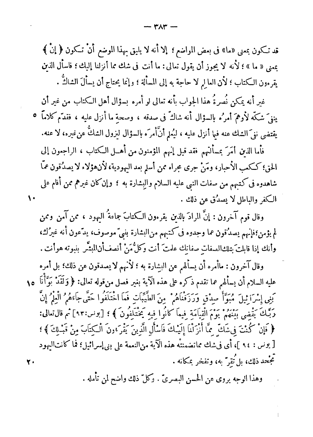 قد تكون بمعنى «ما» فى بعض المواضع؛ إلا أنه لا يليق بهذا الموضع أن تكون إِنْ بمعنى «ما»؛ لأنه لا يجوز أن يقول تعالى: ما أنت فى شك مما أنزلنا إليك؛ فاسأل الذين يقرءون الكتاب؛ لأن العالم لا حاجة به إلى المسألة؛ وإنما يحتاج أن يسأل الشاكّ.