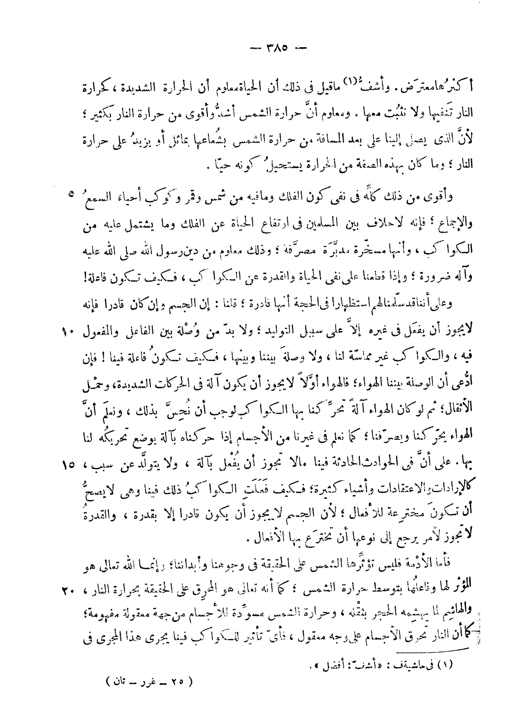 وأقوى من ذلك كلّه فى نفى كون الفلك وما فيه من شمس وقمر وكوكب أحياء السمع والإجماع؛ فإنه لا خلاف بين المسلمين فى ارتفاع الحياة عن الفلك وما يشتمل عليه من الكواكب، وأنها مسخّرة مدبّرة مصرّفة؛ وذلك معلوم من دين رسول الله صلى الله عليه وآله ضرورة؛ وإذا قطعنا على نفى الحياة والقدرة عن الكواكب، فكيف